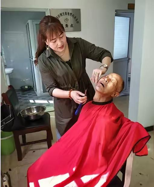 享受啊! 这种老式刮胡子的感觉,真得很让人记忆犹新,也很留恋,只是那种舒服的感觉是躺在升降椅上,先用热毛巾捂捂,闭目养神,享受着老师傅的精心打理,脸额头双鬓,耳朵嘴下巴,自上而下由左到右刮的仔细认真,想想就舒服,多年没体验喽!看到画面中美女理发师的动作,颇有当面感触,只是不知道她为啥不让老人躺下,这样昂着脖子,好难受的样子啊?别一不小心在脖子上来一刀,那可就吃嘛嘛不香喽?