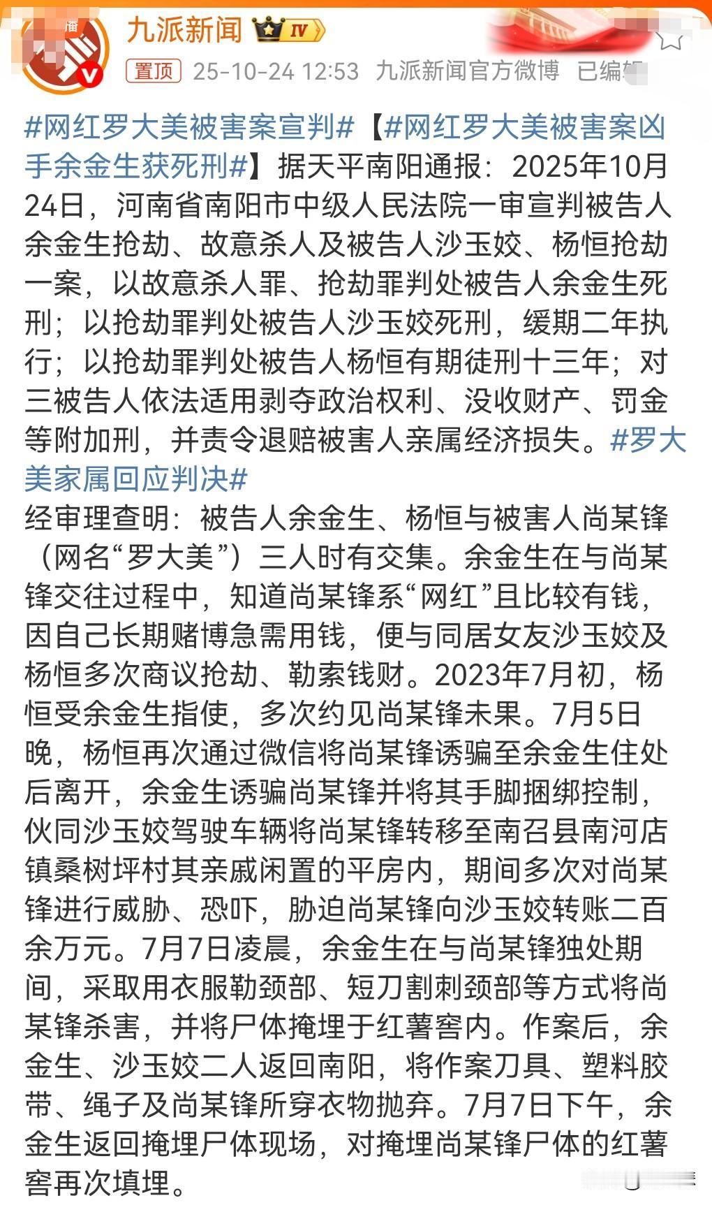 终于宣判了。 等了好久,终于等到。 10月24日,网红罗大美被害案宣判。 余金生被判死刑。 沙玉姣被判死刑,缓期二年执行。 杨恒被判有期徒刑13年。 三人需退赔受害者家属经济损失。 这些人真的是被钱冲昏了头脑,竟然干出抢劫杀人的事情。 这真是太无法无天了。 也希望主犯早日被执行死刑,还死者一个公道。