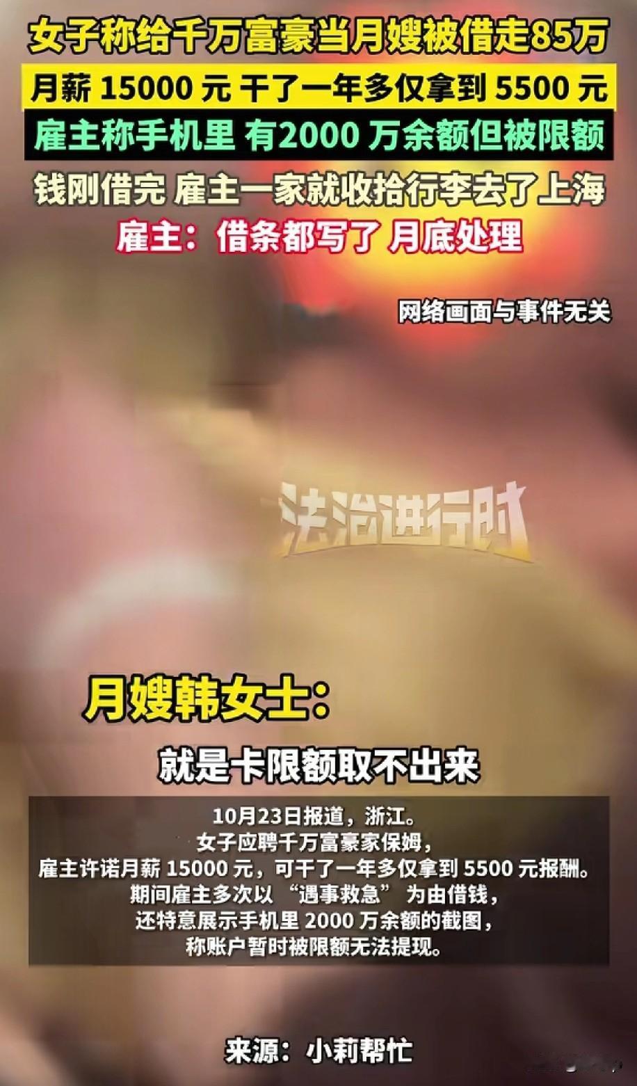 “千万富豪”借月嫂85万 郑州的韩女士在月子中心上班,一位浙江湖州的先生联系她,希望上门照顾,并承诺一个月1万五的工资,于是韩女士就去了,当天雇主就给了5千5,一个月后给雇主要工资时,雇主说银行卡限额等理由一直拖着,还让韩女士看了他的手机里截图银行卡的余额2000万,没过多久就以各种理由向韩女士借钱,前后借了85万,韩女士后来证实雇主家的房子也是租的,而且雇主一家6月份也去了上海,事情曝光后迫于压力雇主给韩女士打了欠条,并承诺月底会处理好,个人觉得这个雇主月底不会处理好,像这种情况他们一定会采取拖延战术,今天推明天明天推后天,起诉才是正确的选择。