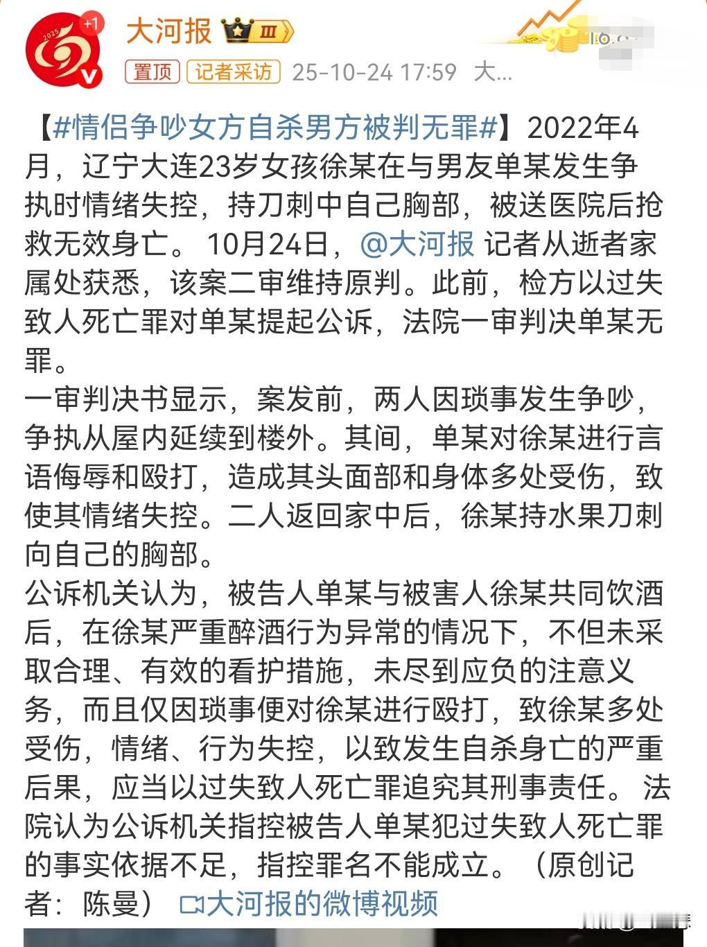 这起案件倒是引起了很大的争议。 情侣争吵女方自杀男方被判无罪。 不过一审二审的判
