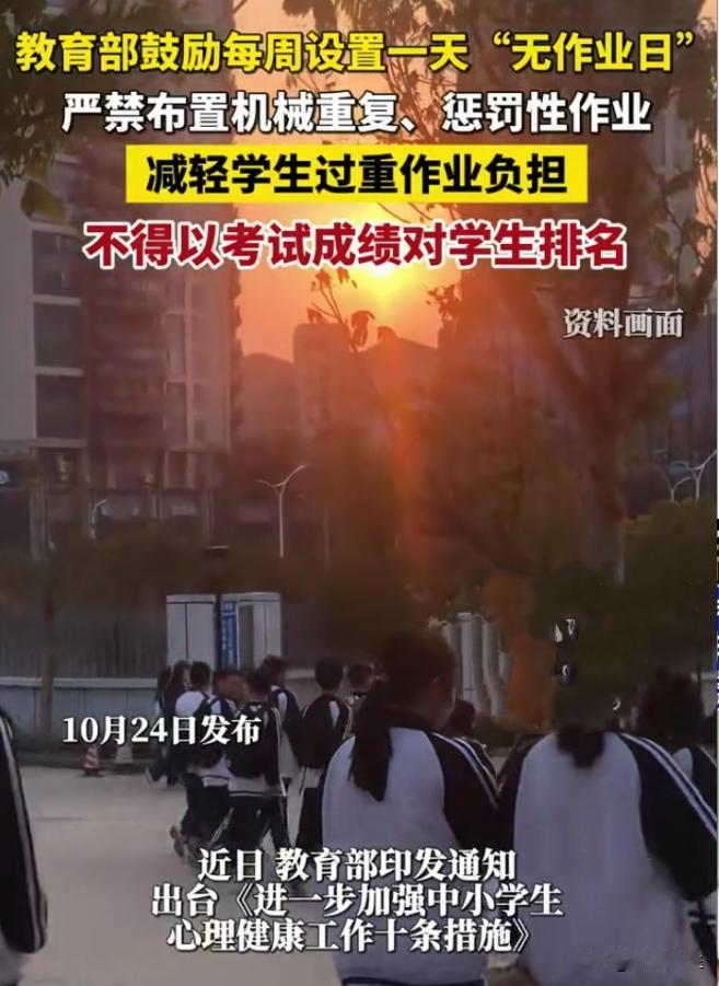 教育部推"无作业日":减负背后是教育理念的深刻变革 教育部近日印发通知,出台《进一步加强中小学生心理健康工作十条措施》,明确鼓励每周设置一天"无作业日",全面落实"体育每天2小时"。 这一举措直指当前中小学教育中的突出问题,体现了从"应试教育"向"素质教育"的转变。"无作业日"不是简单的减负,而是要引导学生自主发展兴趣特长,培养创新思维和实践能力。政策落地需要家校协同,转变教育评价观念,真正让教育回归育人本质。