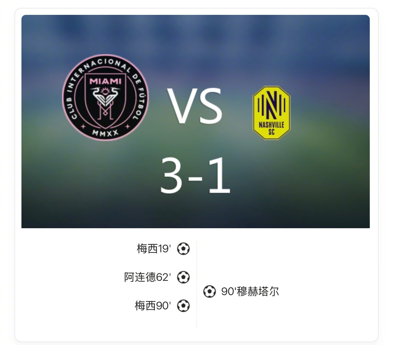 【美职联:迈阿密3-1纳什维尔,梅西双响,阿连德头球破门】凭借梅西、阿连德的进球,迈阿密国际3-1战胜了纳什维尔SC。