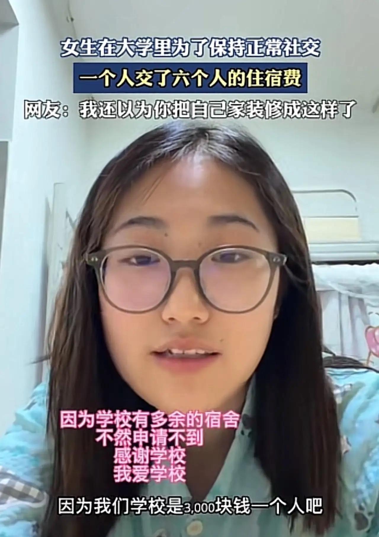 “简直不敢相信!”刷到一个视频,一位女大学生为了保持正常社交,竟然一个人交了六个人的住宿费。据这位女大学生透露:“学校宿舍3000块钱一个人,因为学校有多余的宿舍,于是申请到了!” 此事曝光后,很快引发众多网友热议。有网友当即表示:“如果这是一所正规大学,这条视频发酵以后,绝对会整改,正规大学本科阶段绝对不允许在校住单间,这不是有钱就能办的事!” 也有网友吐槽:“按她这么说,学校肯定是完成不了招生计划的学校!只能是民办,还是比较差的民办!” 还有网友提出质疑:“即便你想交6个人宿舍费,学校也不会同意,再说财务帐也无法入账,除非自己另外租房子与舍友交换!” 客观的说,看到这个视频,周少也有点不敢相信,大学宿舍竟然还敢这么干。如果属实的话,那简直是离谱了。就拿这个费用来说,一个人3000块钱,一年也要花一万多,这是什么家庭,才允许孩子这样,真是长见识了…. 对于这位女大学生的做法,大家怎么看呢?寻美三湘 长沙新朋友 先说说高校住宿的规矩,教育部早有明确要求,本科阶段以标准化宿舍住宿为主,严禁变相售卖单间、搞特殊化,正规公办院校几乎不会触碰这条红线。 民办院校虽管理相对灵活,但财务入账有严格规范,六个人的住宿费记在一个人名下,既不符合财务制度,也违背教育公平原则,实在说不通。 网友的质疑不是没道理,国内高校宿舍费普遍在800-1500元/年,3000元单人价已远超常规标准,再叠加“包六间”,背后是否有违规操作很难不让人多想。 就算学校真有多余宿舍,按规定也该优先统筹安排,而非让学生花钱“包场”。这种做法本质上是把公共教育资源当成了盈利工具,破坏了校园的平等氛围。 女大学生说“为了保持正常社交”,这话有点矛盾。大学集体生活本就是社交的一部分,花钱躲开舍友,反而可能错失锻炼人际交往能力的机会。 再看家庭条件,一年一万多的住宿费,对普通工薪家庭来说不是小数目。过度满足孩子的特殊需求,未必是好事,反而可能让她脱离集体、滋生优越感。 也有网友猜测视频是博眼球,毕竟这类“炫特殊待遇”的内容很容易出圈。但即便只是剧本,也戳中了大家对教育公平的敏感点——学校不该成为花钱就能搞特殊的地方。 高校的核心是育人,住宿安排不仅是后勤问题,更关乎校风建设。如果有钱就能享受单间特权,那寒门学子的公平何在?教育的初心又该放在哪里? 各位读者你们怎么看?欢迎在评论区讨论。