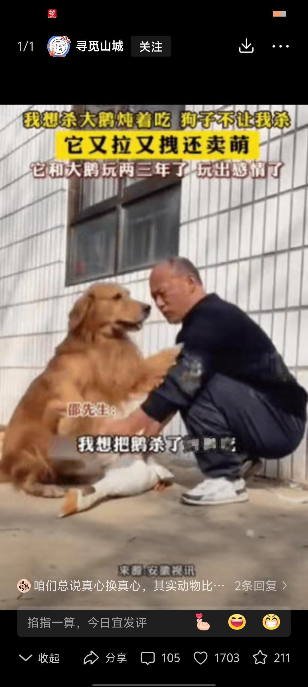 河南一男子准备将家里大鹅杀了炖着吃,结果他刚把大鹅按住,狗子就扑了过来,坚决不让男子杀,甚至又拉又拽还卖萌,原来,狗子和大鹅玩两三年了,现在已经玩出感情了!最后,男子只能无奈放弃! 有网友说:应该是去年春天吧!给鸡和鹅换个地方,从新搭窝,我家黑背直接扑上去摁倒了一只鹅,所有人去想救下鹅都不管用,后来我去喊了一声,救下了,冬天的时候,院子里的蔬菜和花草都下架了,把鸡窝打开了,还是那一只鹅,没有逃脱,被黑背干掉了! 这真是杀鸡儆猴的现象,杀鹅儆狗,狗却不愿意了,强烈抗议主人的骚操作,成功救下大鹅,说明动物界的友情比起人类更加真挚可靠。 咱们总说真心换真心,其实动物比人更纯粹,他不会因为你贫穷美丑而区别对待,只要你每天喂他陪他,他就会把你当成全世界,两个动物在一起,根本没有那么多弯弯绕,饿了一起抢吃冷了一起取暖,处久了就是生死相通的缘分。感情从来不分物种,只分用不用心,你对他掏心,他就敢为你拼命 人许多时候是假感情,而动物妥妥的是真感情,人道理上应该比动物强,实际上许多时候动物比人强! 大家怎么看呢?