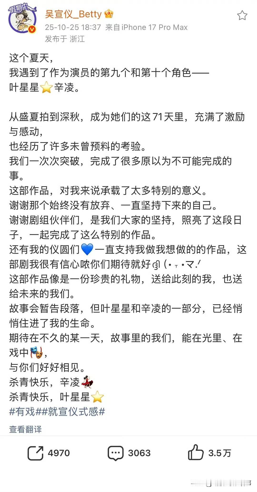 吴宣仪《有戏》杀青,演员路争议声里的坚持 吴宣仪新剧《有戏》刚杀青,她分享了71天饰演叶星星、辛凌两个角色的感悟,能看出对演员身份的认真。 不过不少观众觉得她的角色代入感偏弱,对比同是选秀转型的虞书欣(靠《苍兰诀》小兰花等角色立住演员标签),转型节奏确实有差异。 但从杀青文里的“突破考验”能感受到她的尝试,或许后续作品能看到更多变化?你觉得选秀艺人转型演员,最关键的是啥? 吴宣仪新剧杀青