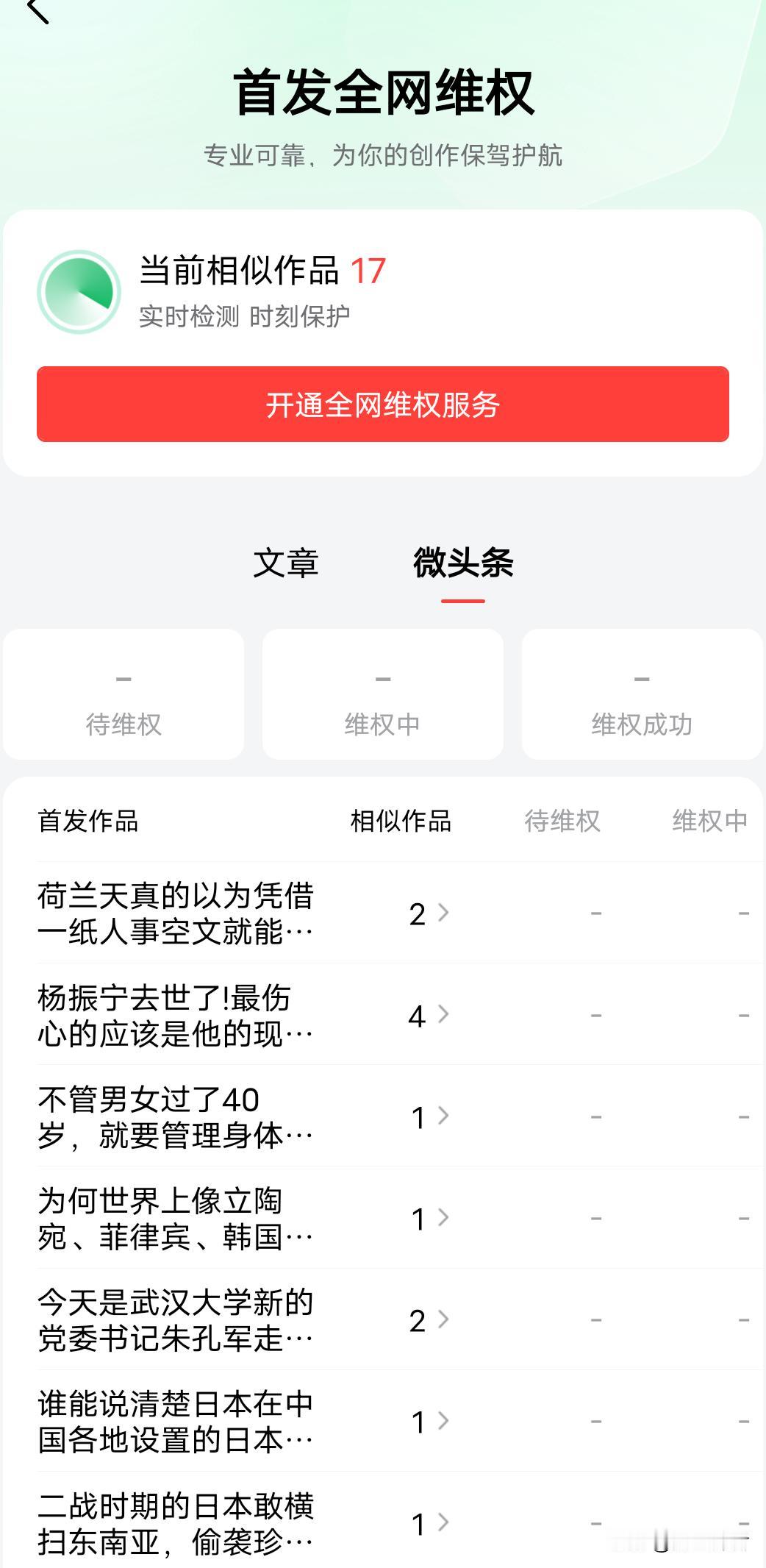这些家伙不讲武德竟然搬运了我的17篇作品。发现这些人好过分,一字也不修改,直接搬运到百度、微博还有其它平台。有些抄袭者的流量甚至比原创作者都要高。你说气人不? 师者写作也不容易,为了写好一篇200字左右的微头条,往往需要构思半小时,还要敲键盘往上打字。这些家伙太不将武德,得来全不费工夫,直接复制粘贴。 本想一键维权,但是开通维权服务太麻烦,要上传身份证正反面,想想还是算了,可能他们也许刚进入写作初创阶段,自己有一碗饭吃,何必断人家财路呢?