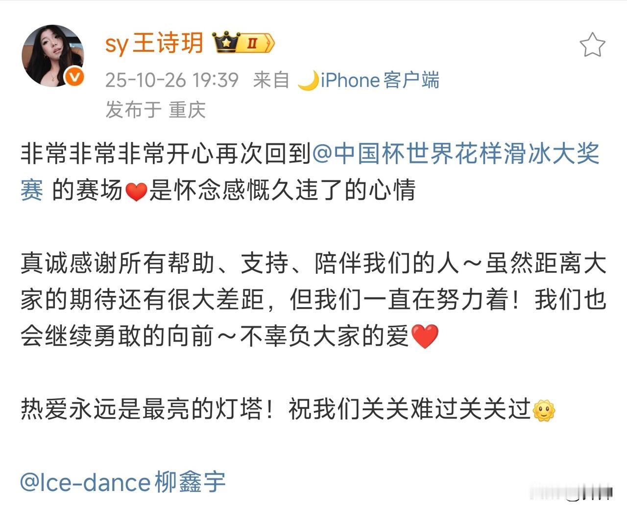 中国花样滑冰的神仙组合:王诗玥,柳鑫宇在中国杯上收获好成绩,赛后二人最新发言出炉 经历了2022北京冬奥会之后,二人都有了很大的进步,同时也一定程度突破了技术瓶颈。这次中国被比赛,二人的成绩是中国队中最好的,韵律舞是62.68分,自由舞是103.03分。总分来到165.71分 期待2026米兰冬奥会,能够看到二人的身影
