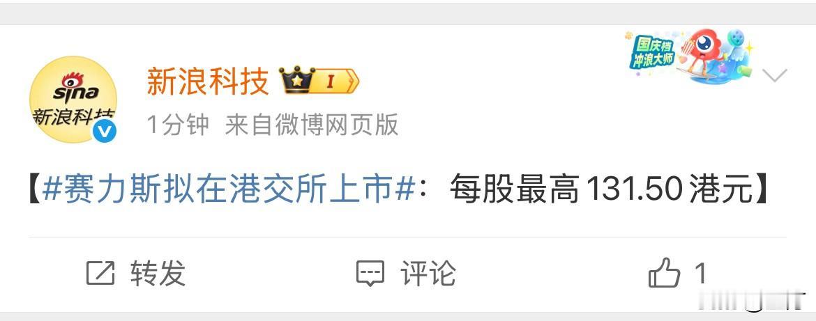 新浪科技:赛力斯拟在港交所上市,每股最高131.50港元! 今天是10月27号,也是星期一,对于赛力斯来说是一个比较好的日子! 因为他们一直辛辛苦苦准备的,期待的上市日期就要到来了! 为了这个事情,他们提前好久就开始布局了,而且他们确实踩到了属于自己企业的发展节点,在很多环节都做到了刚刚好,而且做到了敢于走到前面。 到时候我们看看,他能够把市值做到什么程度,而且现在对他们来说才是开始,在新能源这条赛道上,今后的发展非常的广阔,因为现在这个市场也才刚刚开始! 对于他们以及同行来说,谁都有机会,谁都有无限可能。