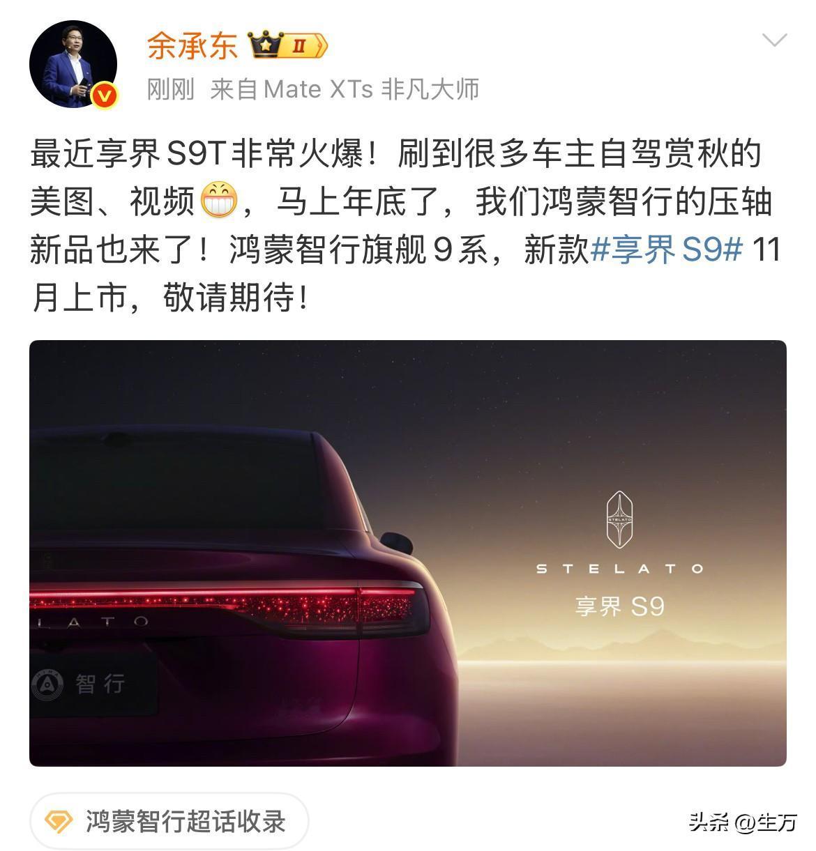 余承东: 马上年底了,我们鸿蒙智行的压轴新品也来了! 就在刚才,余承东在社交网络上放出了一张图,图上面是一台车的尾灯! 他说这台车,是他们今年年底之前的压轴制作,也就是鸿蒙智行旗舰9系,新款的享界S9! 从他放出的这条图看来,这个车身的线条颜色和造型有一股浓浓的流线型的味道,与上一个版本的享界区别还是非常的明显。 但是由于他只是显示了一点点,并没有整体的造型,看不出来具体长什么样子,既然他都说了,这个车的分量不简单,那你说明这个改款,应该与之前的版本完全不一样! 而且可能在价格上也与之前有区别,我们拭目以待下个月,这个车真正的样子!