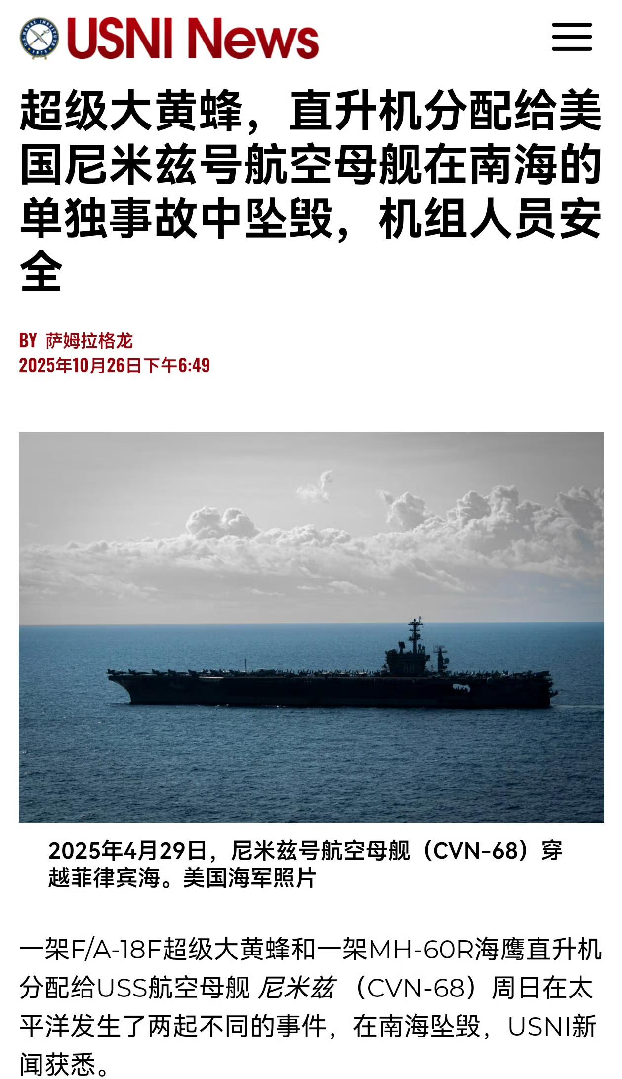10月26日美国尼米兹航母在南海,接连坠毁两架飞机,5名机上人员全部被救起! 下午2点45分左右,MH - 60R“海鹰”直升机,在从“尼米兹”号航空母舰起飞执行任务时坠入南海海域。机上全部3名机组人员被救起。 下午3点15分,F/A - 18F“超级大黄蜂”战斗机同样在从“尼米兹”号起飞执行任务时坠入南海海域。2名机组人员弹射逃生也被救起。 不知道美国的飞机为什么这么容易坠毁,而且隔的时间仅仅半个小时,两个飞机都发生了事故。目前美国军方还没披露发生事故的原因,而且发生事故的原因不仅是在一艘航母上起飞的,还是在一个海域坠毁的。 美国方面说两个事件是独立事件,从两起坠机事件也能看出美国存在一些问题,比如此前就经常被报道出来美国的舰艇和飞机维护保养存在问题,一些舰艇面临着老化的情况。 各位是怎么看的?欢迎评论区留言。