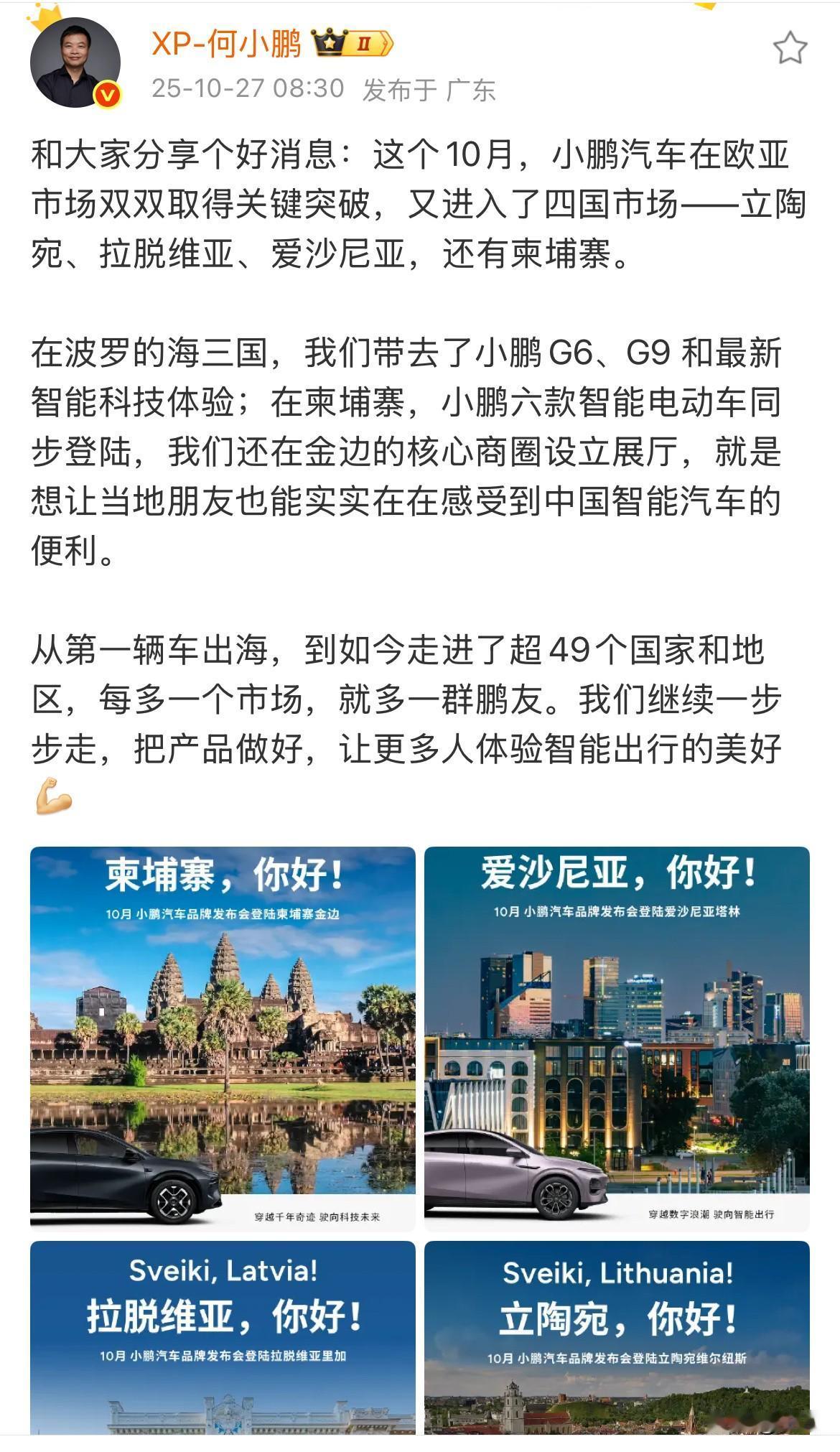 何小鹏:给大家汇报一个好消息,我们又进入了四国市场——立陶宛、拉脱维亚、爱沙尼亚,还有柬埔寨。 就在同行在们在国内卷的风生水起的时候,何小鹏带着他们的新车以及经典车型,真正的在国际市场上面开始竞争了! 当然,他们与比亚迪在国际市场上开拓合作的步伐还是有点不一样的,毕竟现在小鹏的整体实力,如果要去那些比较大的国家与比亚迪正面竞争,他们的优势还是不是那么的明显。 可能何小鹏看到了这一点,所以他无论是在德国还是在法国等等其他欧洲国家,他也只是把那个地方作为一个大的基地,然后把主任的业务去向一些欧亚小国家拓展,或者向东边的沙特等等国家,去推销他们的飞行汽车。 他先把这些有市场前景的,或者本土市场还没有被完全开发的小一点的市场,充分地去把脚站稳了,这本身也是一种产品策略。 因为他们现在已经进入40多个各种大小的国家,所以从这个角度上来说,他们还真的不是小打小闹,而是从战略上和战术上都有充分的布局,这一点还真的值得同行们好好学习。