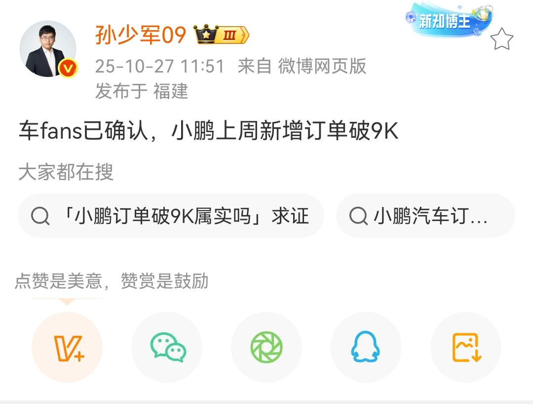 孙少军:车fans已确认,小鹏上周新增订单破9千台! 十一假期过后,各家的新增订单数量都略微有一点下滑,小鹏上周新增订单破9000台是一个非常不错的成绩。 小鹏的新产品增程系列没有上新,等增程系列上新了之后,那么还会在现有的销量上有个非常巨大的提升。 各位是怎么看的?欢迎评论区留言。