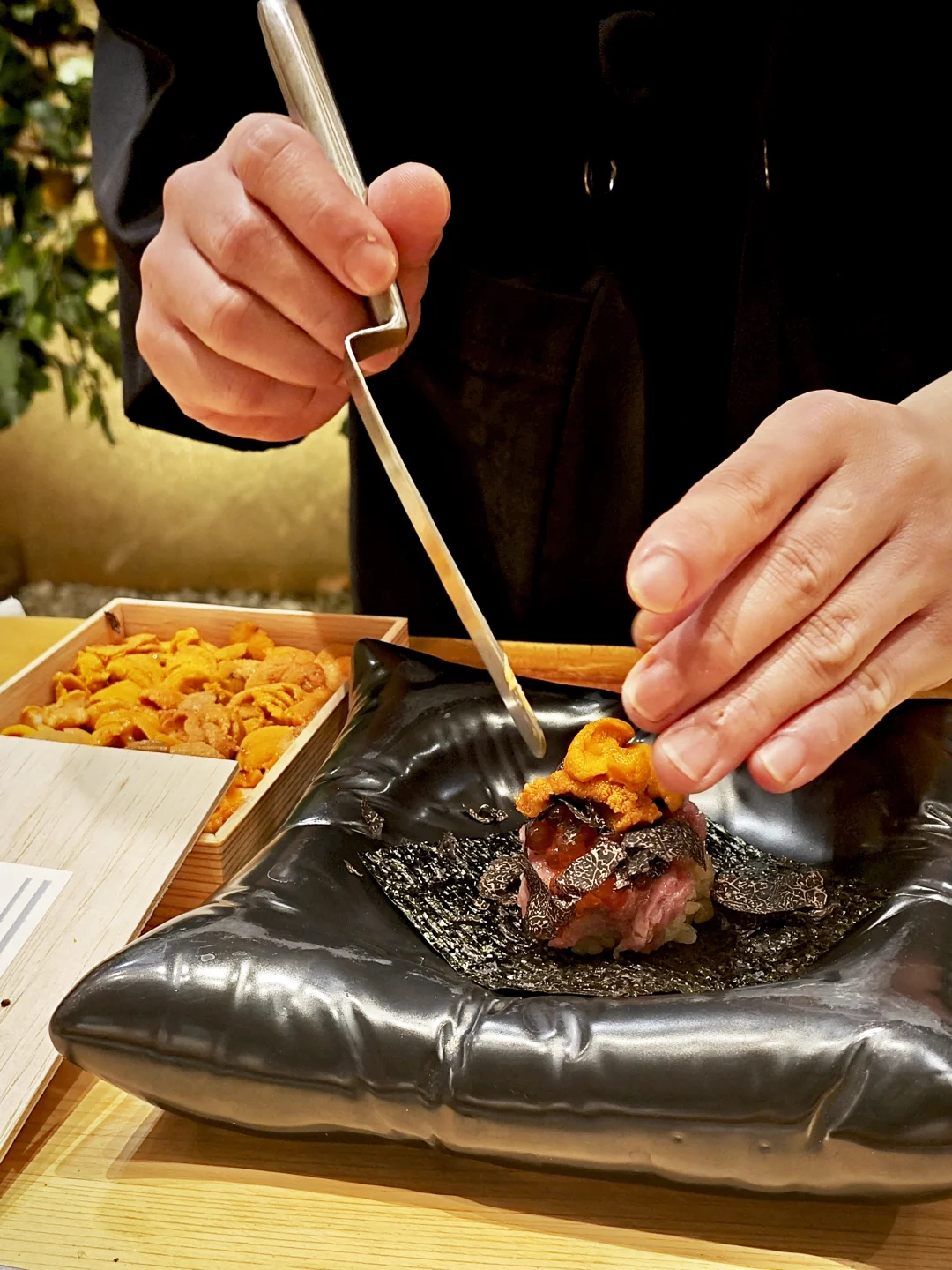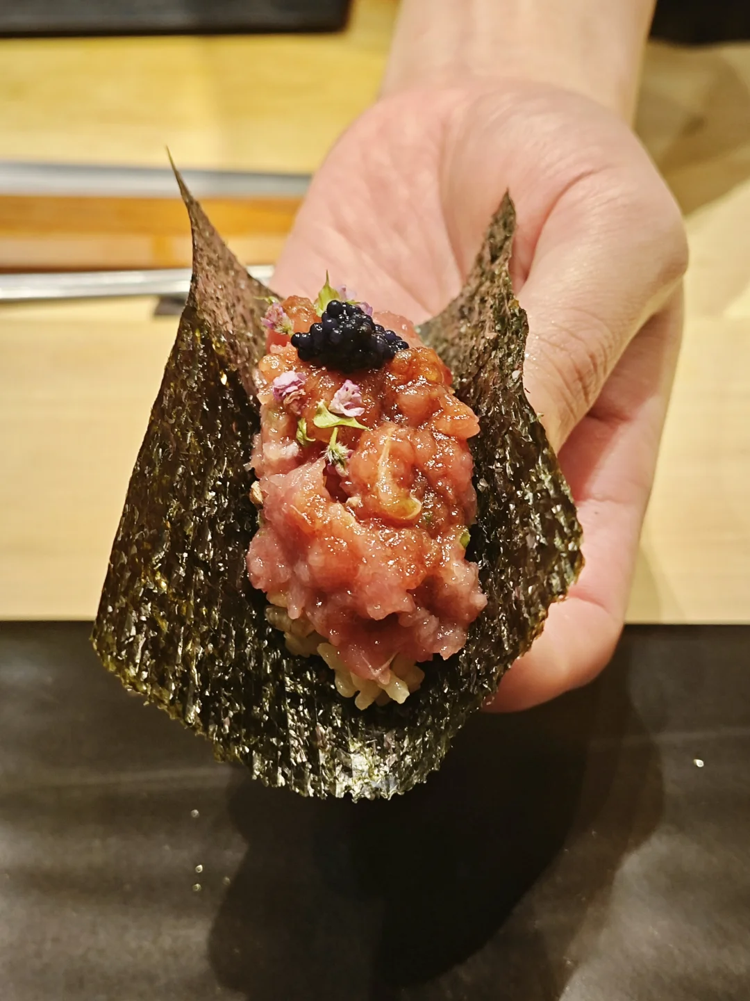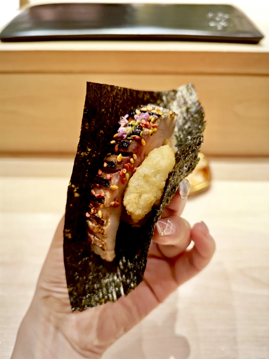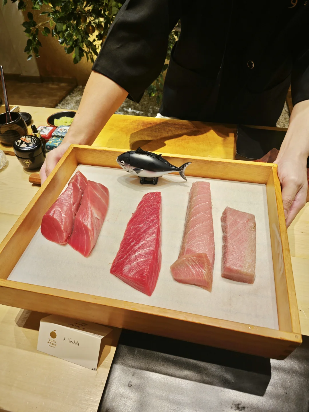 金枪鱼的肉质鲜嫩,炙烧过的表面微微焦香