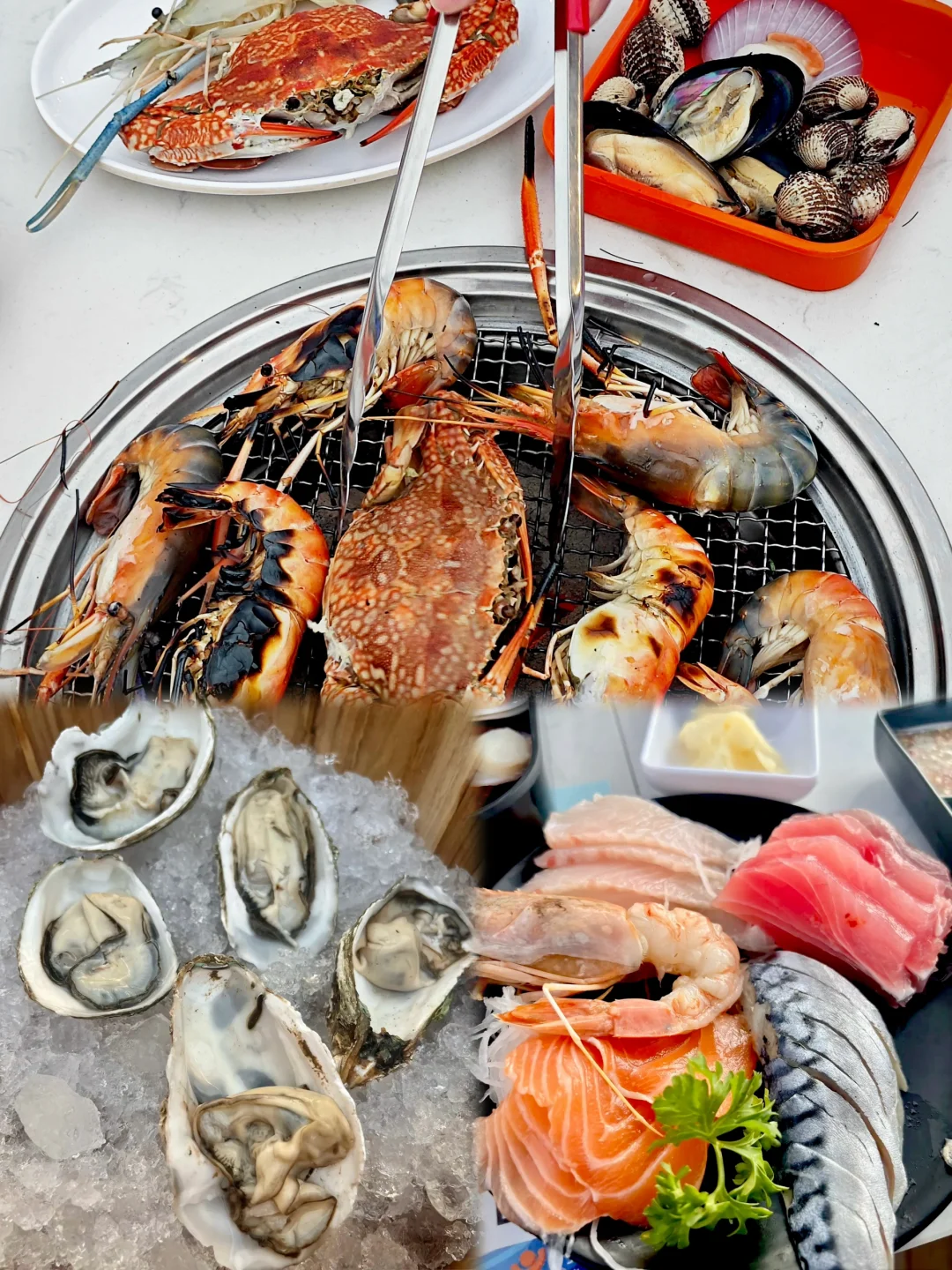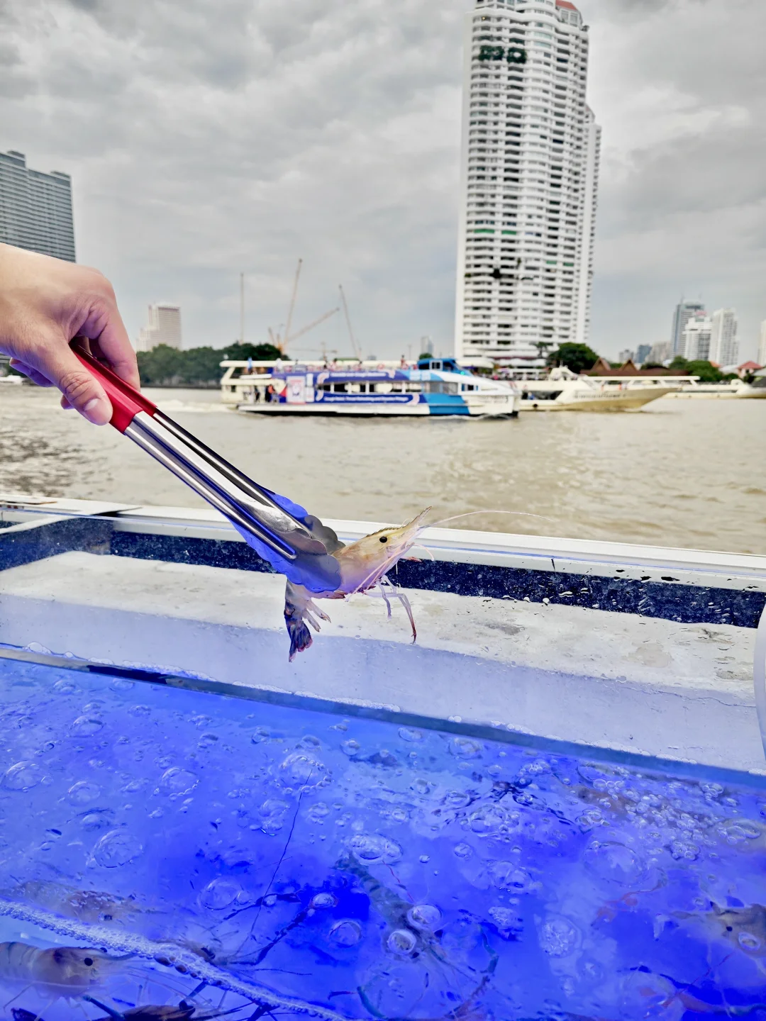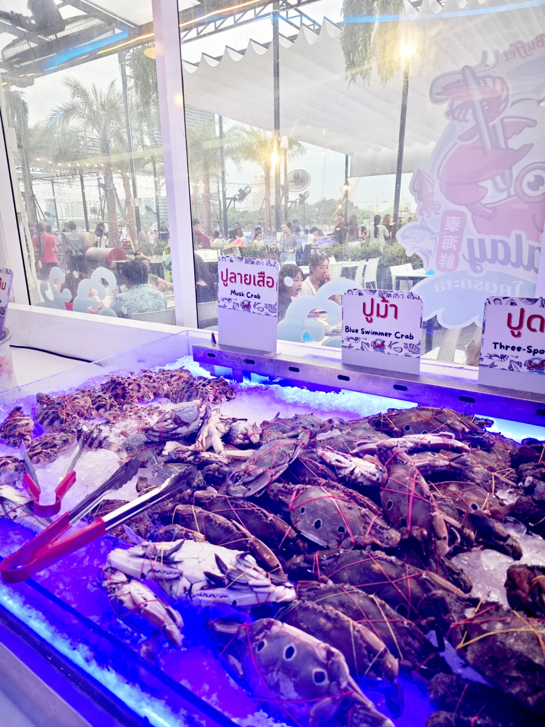 活碰乱跳的青蟹🦀和罗氏虾🦐 就在水缸里等着你去抓 室内还有各种熟食 刺身 生蚝🦪都是现开 还给洗干净了 一炉海鲜 一炉烤肉🥩 才599฿ 不限时吃到扶墙出🥹🥹 夜幕降临 邮轮🛳来来往往 欣赏着湄南河景 简直太Chill了~~ 📍 Kodtalay The Riverfront Seafood Buffet