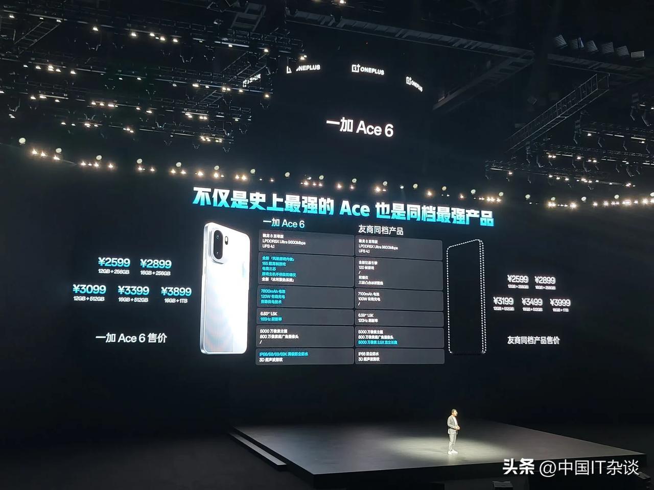 超满配、超预期的一加Ace 6售价2599起!以同档领先的配置打造极致游戏体验。 12+256GB:2599元 16+256GB:2899元 12+512GB:3099元 16+512GB:3399元 16+1TB:3899元 搭载骁龙8至尊版移动平台,出厂写入风驰游戏内核,实现165无限满帧体验,同档唯一超高帧游戏体验,行业最强充电组合7800mAh冰川电池+120W超级闪充,同档唯一165Hz 超高刷高分辨率护眼屏,采用旗舰同款超声波指纹,首批搭载ColorOS 16系统。