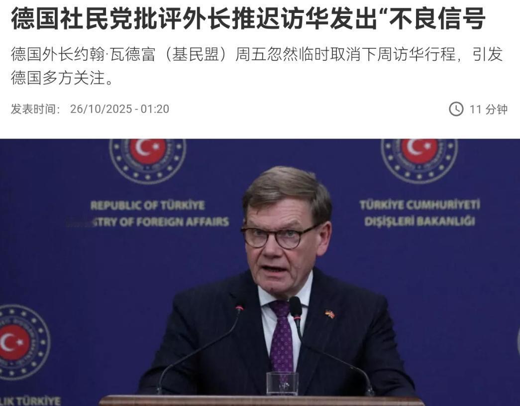 德国外长瓦德富尔闯下大祸,鲁莽取消对华访问行程之后,德国外长遭到德国内部尖锐批评!10月26日,根据法新社报道,德国外长瓦德富尔取消访华行程之后,德国社民党发言人表示,临时取消访华对改善紧张的德中关系来说不是一个好信号。尤其是在全球紧张时期,与中国进行直接对话至关重要。与中国的对话不应中断,而应持续并深化。 最近德国外长瓦德富尔临时取消访华行程的事,在德国国内闹了不小的风波,不少人都站出来批评他,觉得这步棋走得太鲁莽了。 这事得从基本情况说起,瓦德富尔本打算近期开启自己担任外长后的首次访华,这趟行程原本还承担着为总理默茨年底访华铺路的任务,毕竟默茨一直想通过和中国的互动重振德国经济。 可就在出发前几天,他突然宣布推迟行程,德国外交部给出的说法是 “目前未能在中国安排足够多的会谈”,但这个理由显然没能平息外界的质疑。 最先站出来批评的是德国执政联盟里的社民党,他们的外交事务发言人阿赫梅托维奇直接说,临时取消访华对改善紧张的德中关系不是个好信号,尤其现在全球局势这么紧张,和中国保持直接对话太重要了,对话不仅不能断,还得往深了走。 社民党的不满不是没道理,因为这几年德国经济一直没缓过来,已经停滞 3 年了,大家都盼着能通过和中国的合作找到突破口,外长这个时候取消访问,无疑给刚有起色的沟通机会泼了冷水。 不光是政党层面有意见,德国企业界更是急得不行。从瓦德富尔原定的访华团名单就能看出来,德国工业界的代表团集体缺席了,这被不少媒体解读为对他对华路线的不信任。要知道,中国现在对德国经济有多重要,看看贸易数据就清楚了。2025 年前 8 个月,德国和中国的进出口总额达到 1634 亿欧元,超过了和美国的 1628 亿欧元,中国重新成了德国最大的贸易伙伴。 德国的汽车、机械、化工这些支柱产业,全都和中国市场绑得很紧,很多德国企业在中国赚的钱,都是维系总部运营的关键,要是中德经贸关系受影响,德国制造业根本扛不住。 英国《金融时报》直接把这事称为 “默茨政府的超级外交灾难”,德国媒体也说,出访前夕突然取消行程,暴露了政府外交上的重大挫败。大家之所以反应这么强烈,是因为这趟访问本来意义重大。 瓦德富尔是默茨新政府里最早计划访华的部长,原打算和中方谈稀土、半导体这些关键领域的合作,这些都是德国工业急需的资源和技术交流。他自己之前也说过,“脱钩” 不是正确策略,要和中国保持密切经贸合作,可转头就取消访问,这种反复自然让人不满。 更关键的是,这事暴露了德国政府内部对华政策的严重分裂。瓦德富尔来自总理默茨所在的基民盟,他的一些做法延续了前任外长的 “说教模式”,可默茨总理一边喊着要 “减少对华依赖”,一边又计划亲自访华寻求合作,这种矛盾的态度让外界看不透。 北京外国语大学的崔洪建教授就说,推迟访华更多反映的是德国内部的政治矛盾,不是中德关系的整体方向,毕竟默茨政府还在调整政策,对华立场没定下来。 现在全球局势本来就紧张,很多问题比如气候变化、能源危机,都得靠中德这样的大国合作才能解决。 中国外交部发言人也说了,中德作为主要经济体,应该相互尊重、合作共赢,这也是两国人民包括德国企业界的共同愿望。德国《焦点》周刊都评论说,德国外长应该向中国学习,而不是搞说教,毕竟中国的市场和发展经验对德国出口行业太重要了。 德国企业界最明白其中的利害,他们知道一旦中德对话中断,首当其冲受影响的就是自己的生意。 这几年美国加征关税,德国对美出口已经受了挫,要是再丢了中国这个最大贸易伙伴,德国经济真的很难翻身。 中国现代国际关系研究院的孙恪勤研究员说得很实在,要是中德经贸再受冲击,德国制造业根本承受不起。 说到底,瓦德富尔临时取消访华之所以引来这么多批评,就是因为大家都清楚,在当下的形势里,和中国保持对话不是可选项,而是必须做的事。尤其对德国这样依赖出口的国家,断了沟通渠道,受损的只会是自己的利益。默茨总理接下来的访华行程能不能顺利推进,能不能修复这次的负面影响,不仅关系到中德关系的走向,更关系到德国经济能不能摆脱停滞的困境。 毕竟,合作才能共赢,这个道理不管对国家还是对普通人来说,都是一样的。