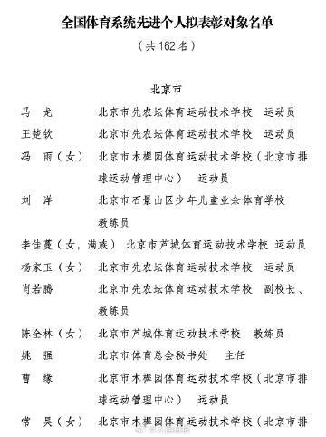 #马龙孙颖莎樊振东等人拟获表彰#【加油!#体育先进个人拟表彰对象公示#】根据全国体育系统先进集体和先进个人评选表彰工作安排,经逐级推荐和评选,全国体育系统先进集体和先进个人评选表彰工作领导小组审核,拟表彰全国体育系统先进集体67个、先进个人162名。为充分发扬民主,广泛听取意见,接受社会监督,现将拟表彰对象予以公示。公示期为2025年10月28日至2025年11月3日。马龙盛李豪 陈芋汐