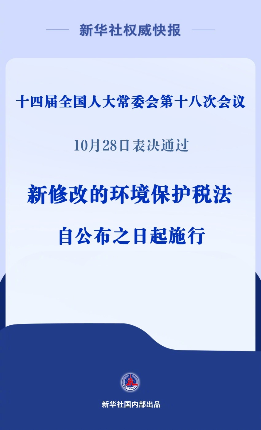 【新华社权威快报|新修改的环境保护税法#扩大挥发性有机物征税范围#】十四届全国人大常委会第十八次会议10月28日表决通过关于修改环境保护税法的决定,并自公布之日起施行。