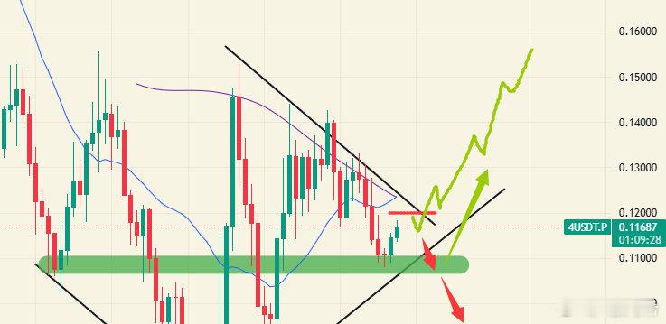 后续来到0.12和结构上沿被压制向下,则继续关注下方支撑是否跌破,跌破可顺势进场。