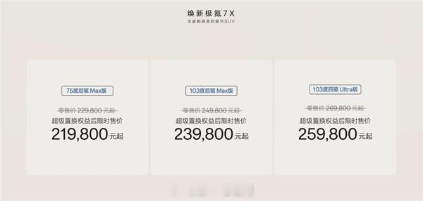 极氪7X 正式上市,共推出三款配置车型,售价区间为22.98-26.98万元,限时优惠价为21.98-25.98万元。官方还提供了总价值6.999万元的购车权益,包括20英寸铝合金轮圈、专属车漆、后排电动组合沙发等配置。