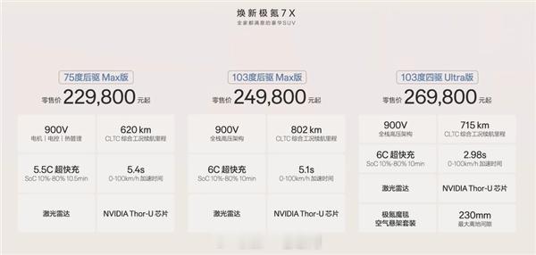 新车升级至900V高压架构,全系标配英伟达Thor-U芯片和激光雷达,提供三款配置选择。75度后驱Max版搭载370kW电机,续航620km;103度后驱Max版续航提升至802km;而103度四驱Ultra版则拥有585kW双电机,续航715km,并配备空气悬架 新能源汽车