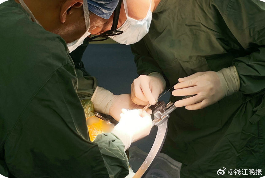 浙大二院神经外科陈高与严锋医生团队为王阿姨开展了手术。用经颅立体定向技术,将经干细胞诱导分化出的成熟多巴胺前体细胞精准移植到其大脑壳核区。