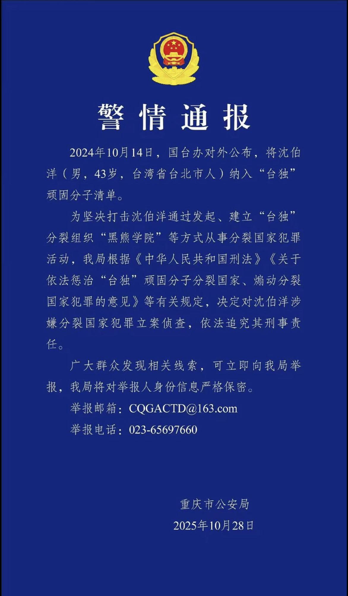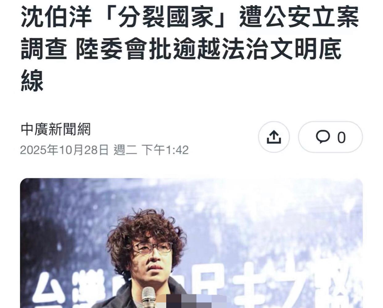台湾沈伯洋涉嫌“分裂国家”遭到重庆公安局立案侦查,依法追究其刑事责任。 沈伯洋迅速发文怒呛道:“没在怕”。 台湾陆委会则谴责大陆逾越底线,没有管辖权。