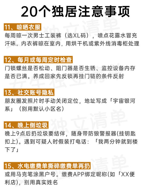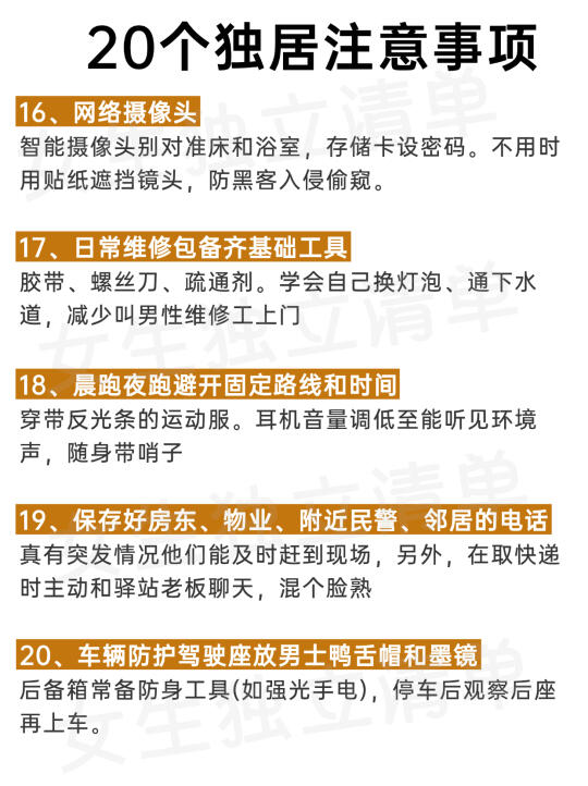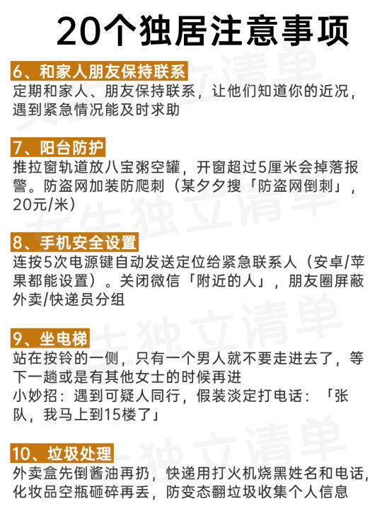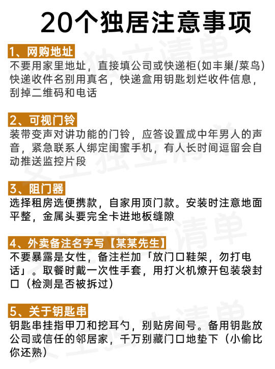 女生一个人独居一定要注意安全!🔥据《2024中 国独居女性安全报告》显示,⚠️79%的独居女性曾遭遇快递信息泄露,⚠️62%表示经历过可疑人员尾随,88%认为现有安防措施存在盲区... ‼️这不是过度敏感,而是城市独居的真实生存挑战,马住这20条独居保命指南,安全无小事! 😷也许很多人都经历过: ⚠️深夜听到门外异响,攥着手机不敢入睡 ⚠️取外卖时从猫眼反复确认走廊是否有人 ⚠️被快递员问「一个人住吗」时后背发凉 ⚠️维修工上门后总感觉物品被移动过 . ......想想都可怕,所以👭姐妹们,一个人生活一定要保护好自己💪 ✅这篇笔记送给独居的姐妹,危险不一定会遇到,但一定要提前防护,防范于未然总不会错‼️