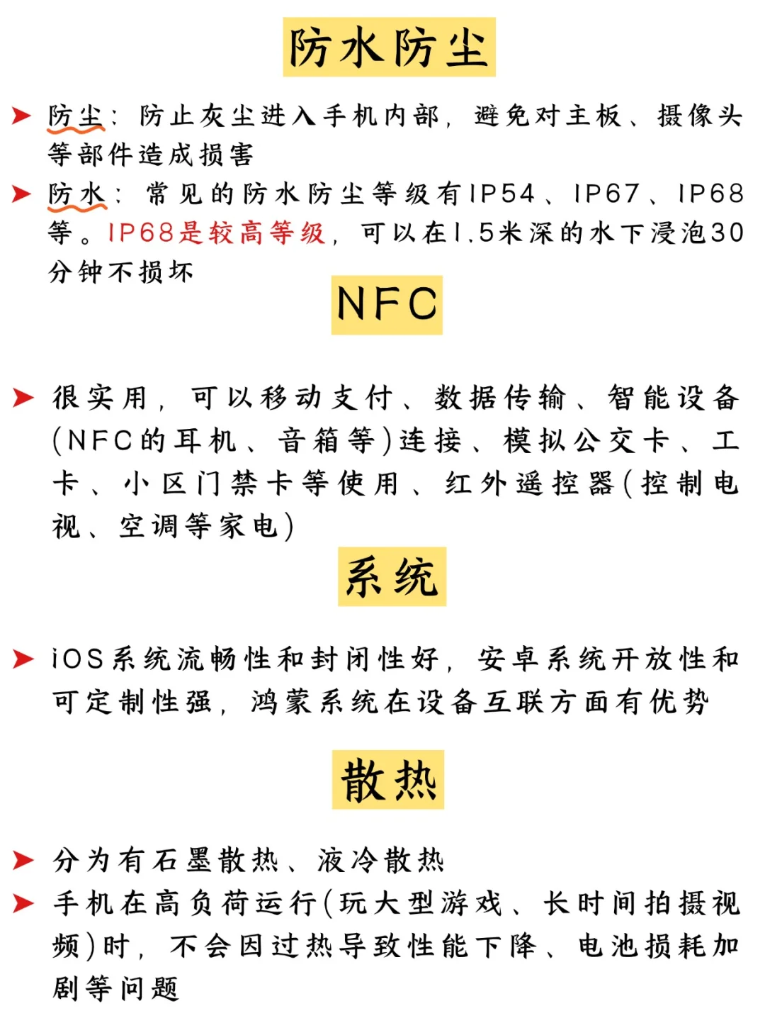 像素、传感器尺寸和光学变焦决定了照片的分辨率和细节丰富程度,📸高像素镜头可拍摄出大幅清晰的照片,此外还要关注麦克风、喇叭、机身材质(陶瓷>金属>玻璃>塑料)、数据线接口、防水防尘、NFC、系统、散热等