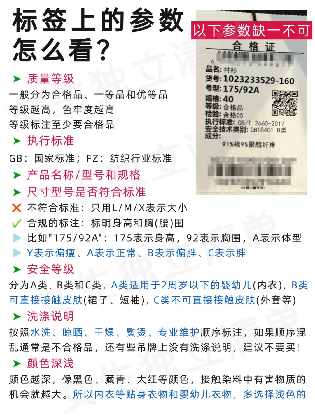 👭姐妹们,买衣服千万不要只看价格和尺码咯,衣服合不合格,这些参数也非常重要! ✅产品名称 ✅产品型号和规格 ✅面料和成分含量(可在水洗标上) ✅执行标准 ✅安全类别和标准号 ✅制造商名称和地址 ✅维护方法(在水洗标上) 💪这些参数缺一不可!如果是网上购买的姐妹,可以找商家要一下吊牌和水洗标,跟着图上对一对,💡仔细研究下,就能避开大部分的坑,希望姐妹们都能买到满意的衣服~ 👭你学会了吗?