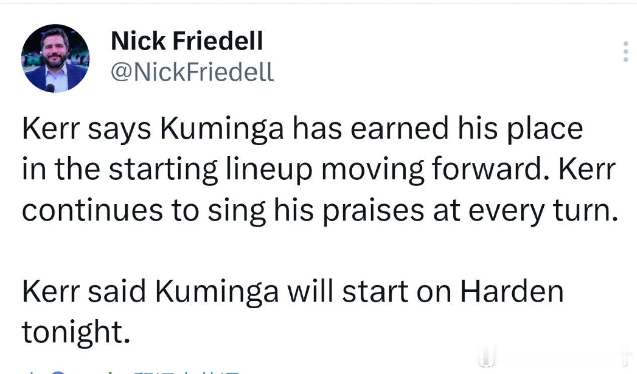 本赛季,库明加已经主防过东契奇和莫兰特,今天他将主防詹姆斯·哈登。