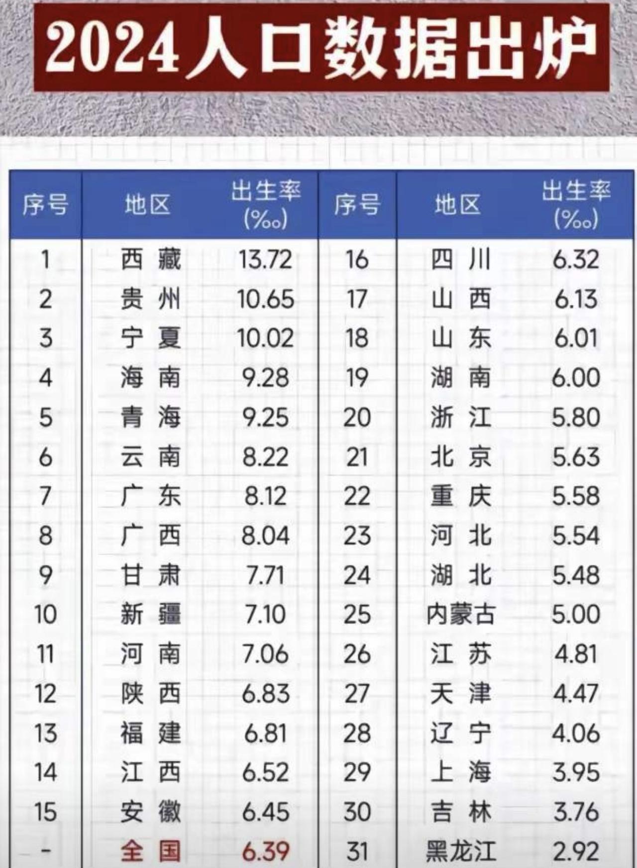 广东省,成为所有经济大省里,唯一一个杀进高生育榜单者,堪称异类。我国去年出生了900多万人,广东省就贡献了100多万,且连续七年破百万,成为全国唯一。 广东生育率为什么“遥遥领先”?我特地问了5个广东人,他们看法各不相同。请听—— 第一位是律师朱小光,他认为广东的高生育率背后,是穷导致的。他说:“广东除了珠三角,其他地方都穷,是中国贫富差距最大的省份。还有广东非常注重传宗接代,宗族观念非常强。还有一个因素:广东的很多出生率,是外来务工者贡献的。” 第二位是工程师刘炜,他的回答很有意思,他说:“广东的个体户很多,孩子生下来可以继承自己的钱。经济发达地区的都是大公司,学历和经验不能留给子孙,所以不生。你看宗庆后的公司,留给女儿宗馥莉,不就是典型的接不住吗?” 第三位是个老广东,住在广州白云区,是个体户周锦,他认为广东的高生育率背后,只有一个唯一影响因素,就是宗族文化。他说:“在广东,宗族文化最为盛行的,就是潮汕、梅州、广州、湛江这些地方。你如果多了解一点,就会发现:广东生育率高的,就是这些宗族文化最盛行的地方,前十全是这些地方。第一东莞,第二汕头,第三佛山,第四广州,第五揭阳,第六茂名,第七湛江,第八珠海,第九潮州,第十深圳。当然,这里有个重大漏洞,就是非常盛行宗族文化的梅州,生育率并不高,这是因为它这里流行客家文化,不一样。” 第四位是银行职员陈伟,他认为广东省生育率高的背后原因与广东高学历年轻人不多有关,他觉得受教育程度越低越保守,也就越愿意生。相反,受教育程度越高,思想越开放,越不容易生孩子。他说:“我身边生孩子多的,都是受教育程度并不高的,我一个同学,高中毕业的,生了两个了,前几天又生了一对双胞胎儿子。你看东北人受教育成都普遍高,思想开放,他们就不愿意生。这种学历不高的,就非常愿意生。 广东教育普及率不够高,特别是粤西,粤东也算比较一般,所以,生育率自然也就高上去了。” 第五位是工厂负责人李小秦,她认为:广东生育率高,与广东的父母很强势有关。她说:“江浙沪的亲子关系相对平等,早早划清了代际关系,想让子女赡养老人,那父母得维持高强度的物质和情感投入,不然想都别想。而广东的父母则非常强势,属于父母剥削子女的地区,剥削非常严重,父母当然认为子女多生育好,对自己有利啊,反正又不用自己生,顶多带一下,子女还要交家用。” 她还认为:广东根深蒂固的重男轻女思想,也会催生生育率。她说:“重男轻女,所以生了女儿再生,再生还是女儿接着生,一直生到男孩为止。如果生的是男孩,就想要更多男孩,重男轻女思想,拔高了广东的生育率。 重男轻女家庭,一定孩子多,这种家庭对后代的培养有一种赛马逻辑,小时候散养,能考出成绩就读大学,考不出来就打工、做生意,反正孩子越多,出来一个有出息的概率就越大。最后父母百年,哪个孩子有出息,哪个孩子就继承家业,其余的随便分点点钱然后自生自灭。为了博概率,他们拼命多生,生育率自然就高了。” 对此,你们有什么可以补充的?欢迎留言评论。图为24年人口数据