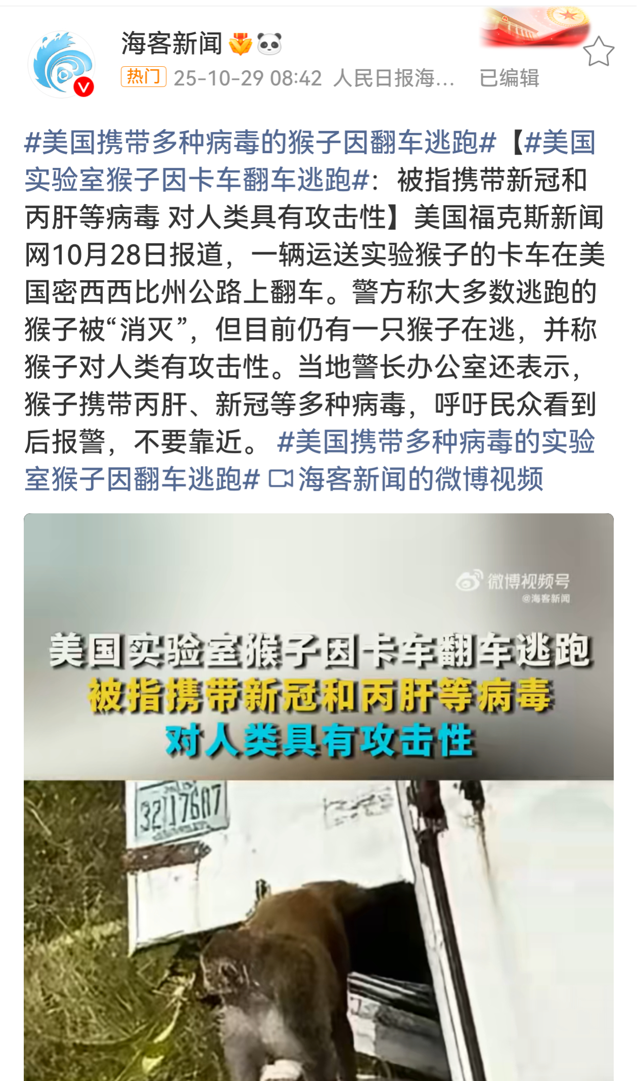 美国又有实验用猴跑了美国携带多种病毒的猴子因翻车逃跑新冠病毒covid19源自哪里