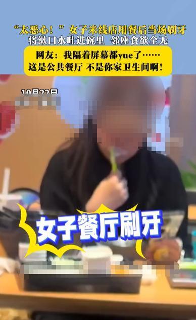 “太缺德了!”10月11日,北京,一女子在米线店用完餐后,竟然拿出牙刷牙膏当场刷起牙来,随后又将自己的漱口水吐进面前吃饭的碗里,网友:隔着屏幕都看吐了! 那个周五中午,北京朝阳区某商场三楼的一家米线店里,发生了一件让其他顾客直摇头的事。一位穿着黑色外套的女顾客吃完米线后,从随身的帆布包里掏出了牙刷和牙膏。 周围几桌客人都以为她要去洗手间,没想到这位女士直接在座位上刷起了牙,更让人意外的是,她刷完牙后,端起刚才吃米线的碗,把漱口水吐了进去,然后继续刷第二遍。 邻桌一位正在吃饭的男士看到这一幕,筷子停在了半空中,碗里的米线也不吃了,他后来对店员说,突然就没胃口了,总觉得膈应。 这件事被店里另一位顾客拍下来发到了网上,评论区炸开了锅,有人说自己以前在火锅店见过类似情况,一位大妈吃完饭在座位上剔牙,把牙签直接扔在调料碗里,还有人提到在快餐店遇到过脱鞋抠脚的,甚至有人在星巴克给孩子换尿布。 其实商场每层楼都有洗手间,从这家米线店走到最近的卫生间也就二十来米,不到一分钟的路程,洗手间里有洗手台、镜子,刷牙漱口都很方便,还不会影响到别人用餐。 餐馆的碗筷虽然每次使用后都会经过清洗消毒,但想到可能被当作漱口杯用过,下一位顾客心里多少会有疙瘩,这跟用餐巾纸擦嘴、用筷子夹菜是完全不同的概念,毕竟漱口水里混合着食物残渣和口腔分泌物。 这种情况也挺为难的,米线店的老板后来接受采访时说,当时服务员看到了但不知道该怎么劝阻,担心说重了顾客不高兴,说轻了又不起作用,事后只能把那个碗单独拿出来,多洗几遍才放心拿出来用。 公共场所的文明不是靠哪一个人就能维护的,需要大家都有这个意识,就像排队买东西不插队、看电影不大声说话、坐地铁不外放音乐一样,这些都是为了让公共空间里的每个人都能舒服一点。 “好家伙!我真是开了眼了,这大姐是把米线店当成自家卫生间了吧? 吃完饭想刷牙没问题,但也不能这么不讲究啊,商场里又不是没卫生间,多走两步能咋的?非要在人家吃饭的碗里吐漱口水,这操作实在太膈应人了。” “要我说这就是典型的“假干净”,自己口腔卫生是注意了,可考虑过别人的感受吗?想想下次有顾客可能就是用这个碗吃饭,哪怕消毒过了,心理上也觉得别扭啊。” “这让我想起之前有些餐饮店员工的不当行为,虽然性质不同,但都让人对公共餐具的卫生状况多一层担心。” “其实公共场所的卫生需要大家共同维护,国家对于公共场所的卫生管理,包括公共用品用具的清洗消毒是有明确规范的,但再严格的消毒流程,也架不住有人这么折腾餐具啊,这种行为真的有点缺乏公德心。” “我觉得店家也应该留意一下这种情况,毕竟影响到其他顾客的体验了,现在很多人对外出就餐的卫生状况本来就很在意,看到这种场面,估计好几天都不想碰米线了。” “ 眼不见为净”有时候是自我安慰,但亲眼看到这种场景,真的会留下心理阴影,咱们在外面还是得多为别人着想一下,基本的公共道德还是要有的。 你在外就餐时,有没有遇到过什么让你觉得特别膈应或不卫生的行为?如果是你遇到这种在碗里吐漱口水的情况,你会怎么做?  信息来源:大象新闻