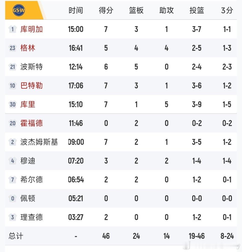 半场被反超,勇士最多领先多达15分,目前46:49落后快船