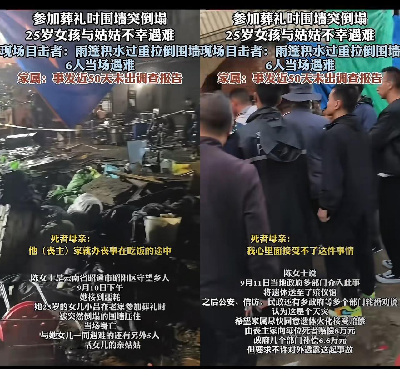 后续来了,村民办丧事围墙倒致6人死亡的原因查出来了,而且很不起眼。 云南那场丧事围墙倒塌的悲剧,真凶居然是块没铺斜的篷布。三米高的直墙本就年久失修,头顶篷布没留排水坡度,下雨时兜住满满一汪水,重量全拽到了葡萄藤铁丝上,最后连墙带布砸向吃饭的人。 更让人揪心的是,遇难者里有个刚毕业的姑娘,正备考公务员,父母哭得快崩溃。办丧事的村民也惨,自家遭了难还得赔巨款,谁能想到遮雨的东西能成杀手? 这哪是意外,分明是“安全盲区”害的。临时搭建哪怕留个0.3%的坡度(就像施工规范要求的那样),积水排走就不会出事。 别总说“想不到”,人命关天的事,细节就是保命符。你们身边办酒席时,还见过哪些容易被忽略的隐患?