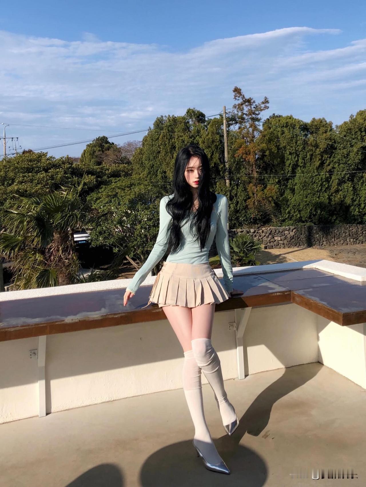 优雅黑发美人,静坐沉思,裙摆飘逸,气质非凡。漂亮小姐姐 大长腿