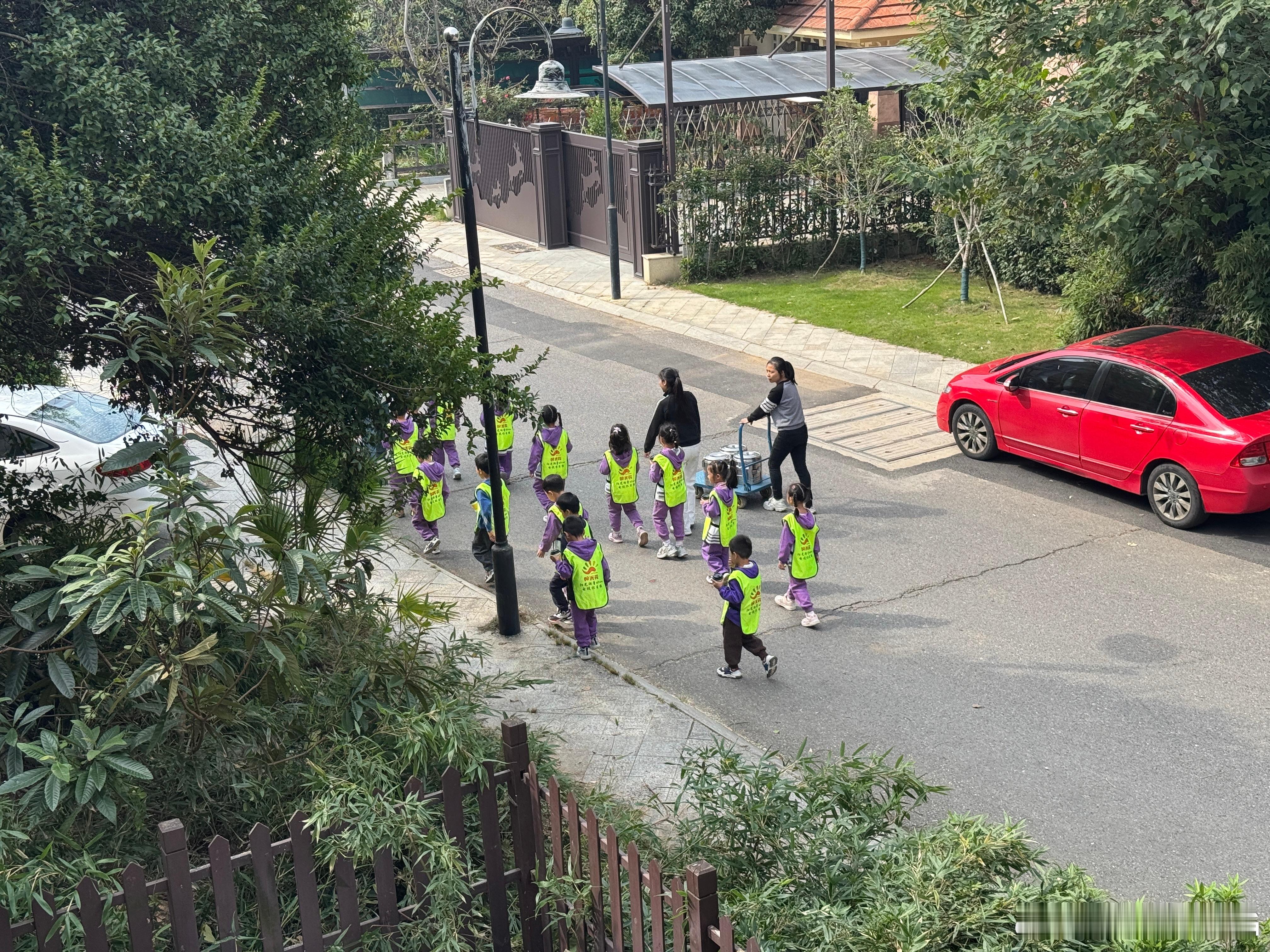 幼儿园小朋友们在小区里秋游,太可爱了,老师们也很可爱