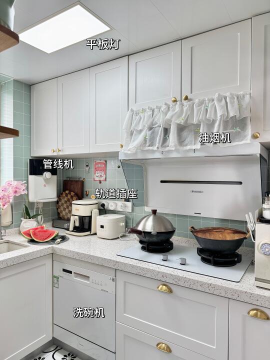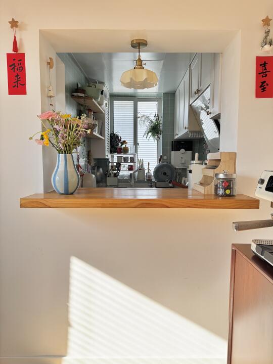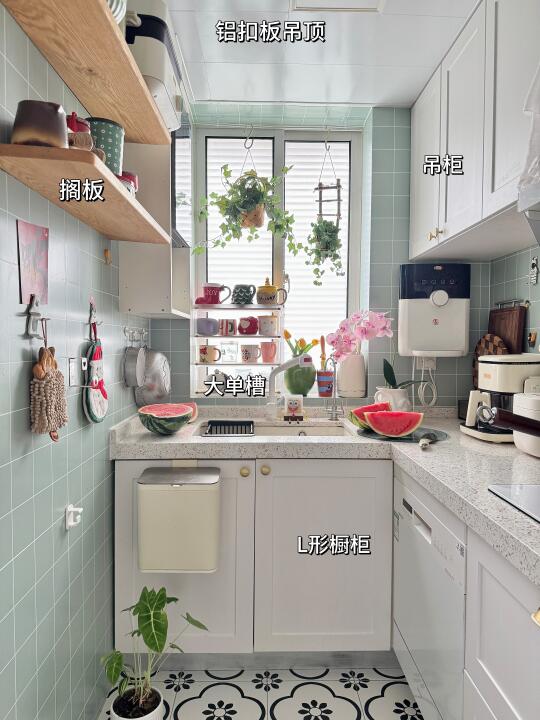 🟡关于厨房 坐标上海,厨房3.7平米 ◾️尺寸:2.37m*1.55m ◾️L型橱柜,中间过道93cm ⚪️厨房巧思 室内窗连接客餐厅和厨房, 让空间更通透显大。 同时,也是个小吧台, 上可用餐,下可储物。 🟤厨房设计 ▪️动线设计:围绕【洗、切、炒、盛、上】菜动线 ▪️正对窗户的台面上安装了大单槽,能放得下锅,洗菜刷锅很方便 ▪️3平米的小厨房,真是寸土寸金,但应有尽有,安装了洗碗机、垃圾处理器、油烟机、净水器、燃气热水器。
