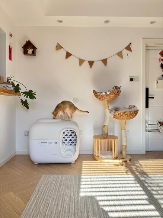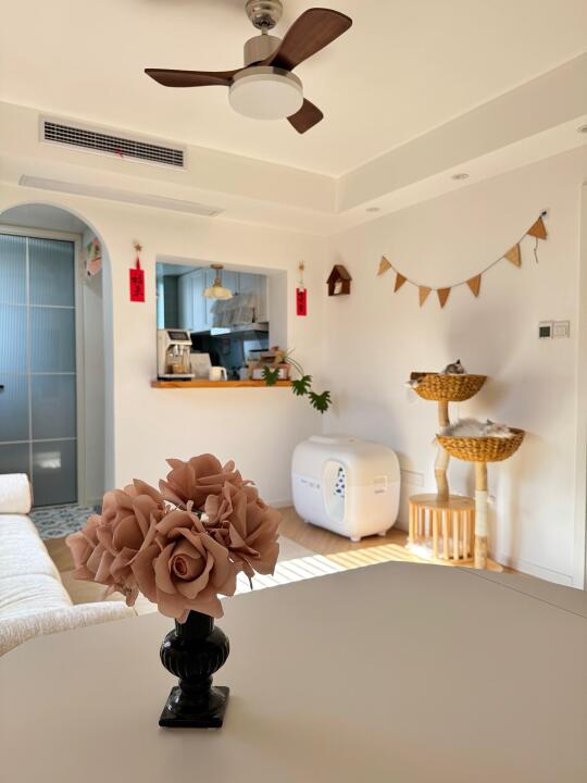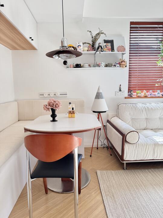 朋友来我家, 说感觉我家不像65平, 像八九十平。 当我告诉他客厅➕餐厅15平, 他更是感觉很惊讶。 📍坐标上海,客厅是我家最得意的设计之一 📌客餐厅一体,开间4.5*3.3m,层高2.56m ✨建面65平,套内51平 ✨两室一厅,两人三猫 ✨沙发2m,餐桌1m,地毯1.6*2.4m