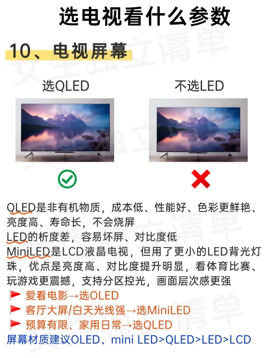 大客厅、白天看得多→Mini LED/QLED(亮度高、抗反光)