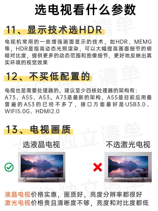 现在电视机五花八门,参数和功能多,看的人眼花缭乱的,一不小心就会多花钱买到鸡肋的配置,或是没搞清参数,买错就亏大发了!👉其实选电视不用复杂,只要抓住这些必要选购参数,搞清楚该选什么、要避什么,就能轻松选到适合自己的款~