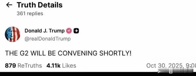 看来美国总统特朗普对中国还是很重视的,毕竟这才是本次东亚行的主菜,前面的都是些开胃小菜。他在会晤前还特意在社媒发文:G2即将召开! THE G2 WILL BE CONVENING SHORTLY! 聊特朗普 特朗普发难 特朗普外交突袭 特朗普怒怼 日本特朗普 特朗普外访 特朗普韩国