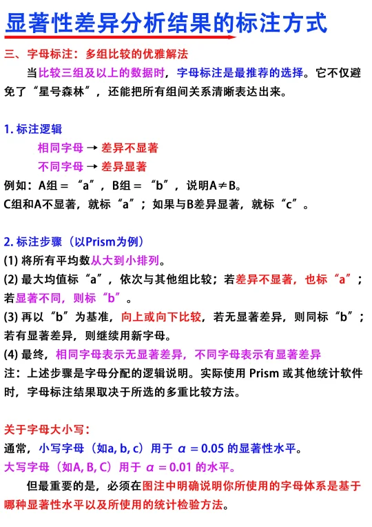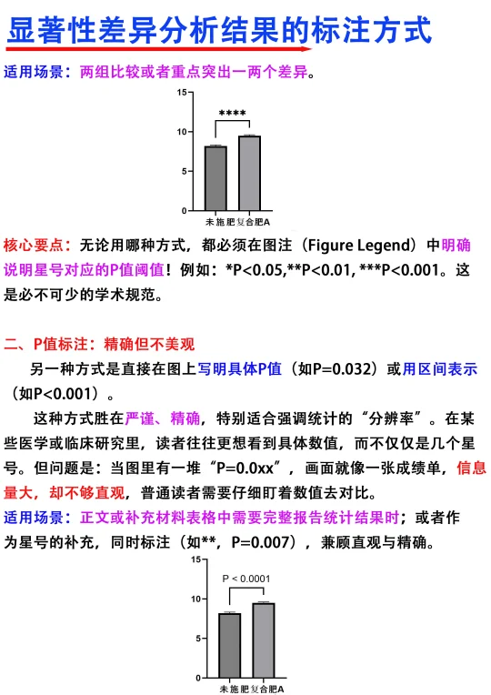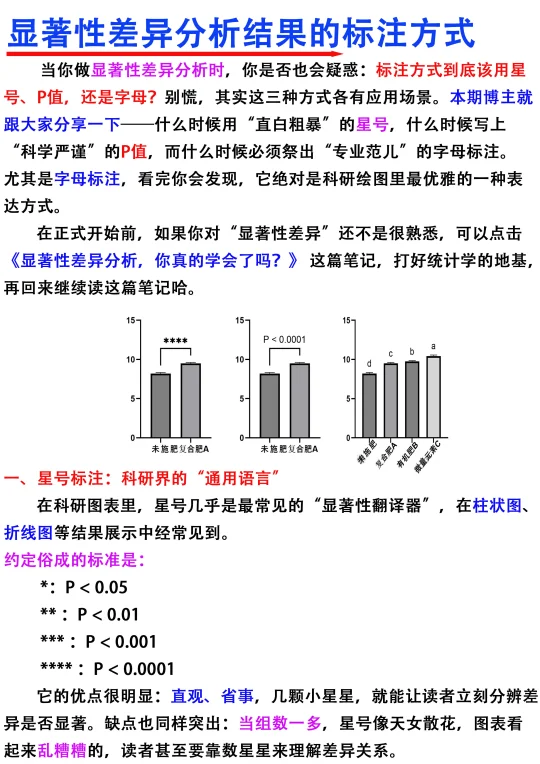 [飞吻R]Hi~大家晚上好,我是科研废物今天分享的是显著性差异分析的结果标注方式[哇R] [向右R]主要从以下五个方面进行分享 1️⃣星号标注 2⃣️p值标注 3️⃣字母标注 4️⃣多重比较方法 5️⃣三种标注方式的选择逻辑 满满的干货与tips ,欢迎大家👍收藏,一起交流讨论呀 图文笔记还有人看吗[微笑R]