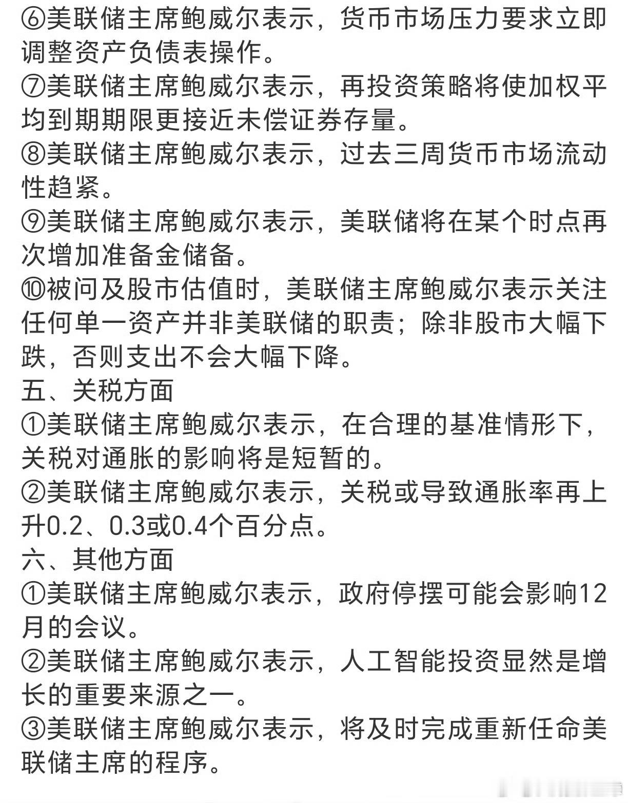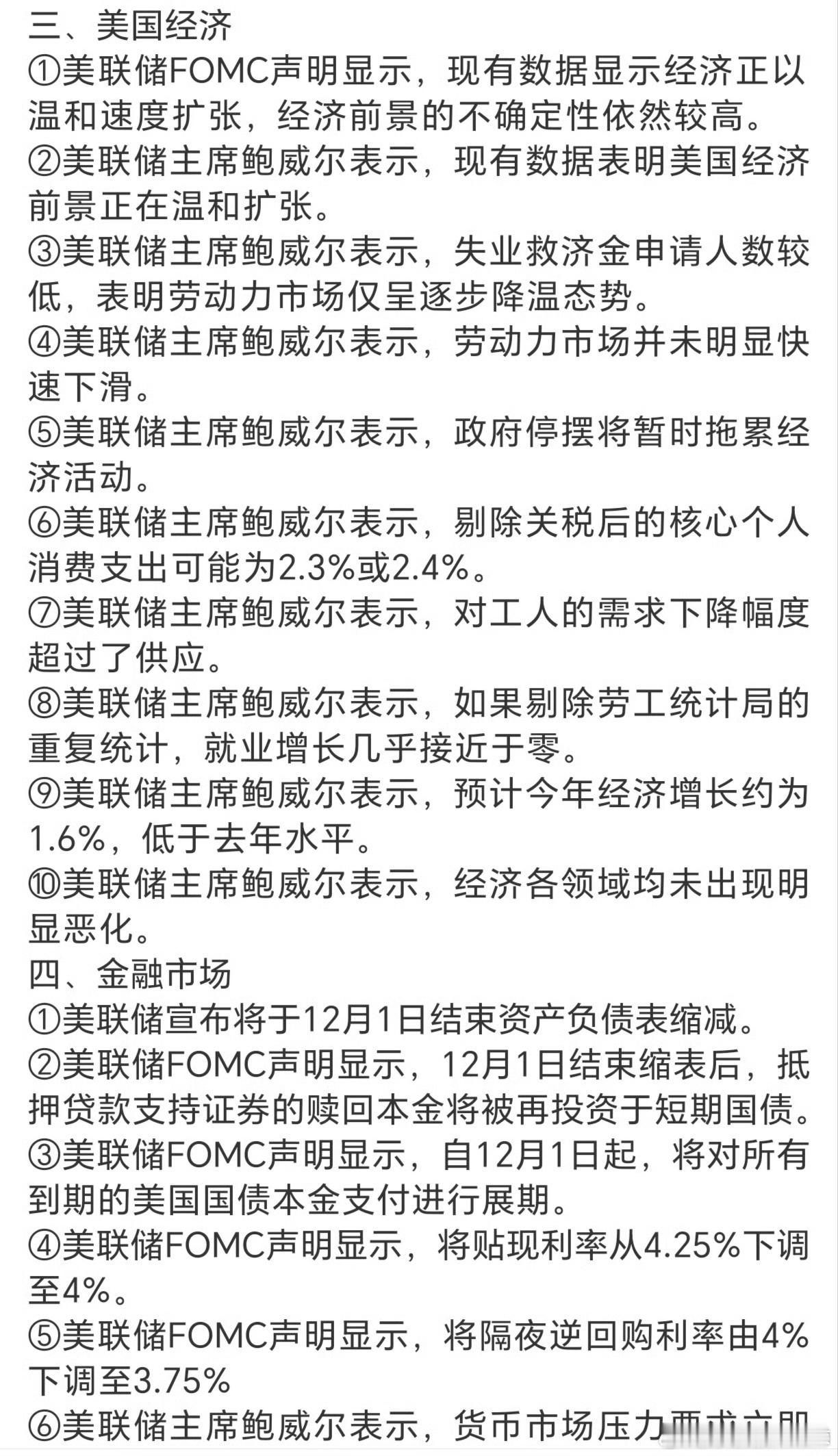 美联储明确说年底(12月1日)停止“缩表”(以前是收紧市场上美元的数量),而且以后还会根据需要增加“放水”(补充银行手里的储备金)。