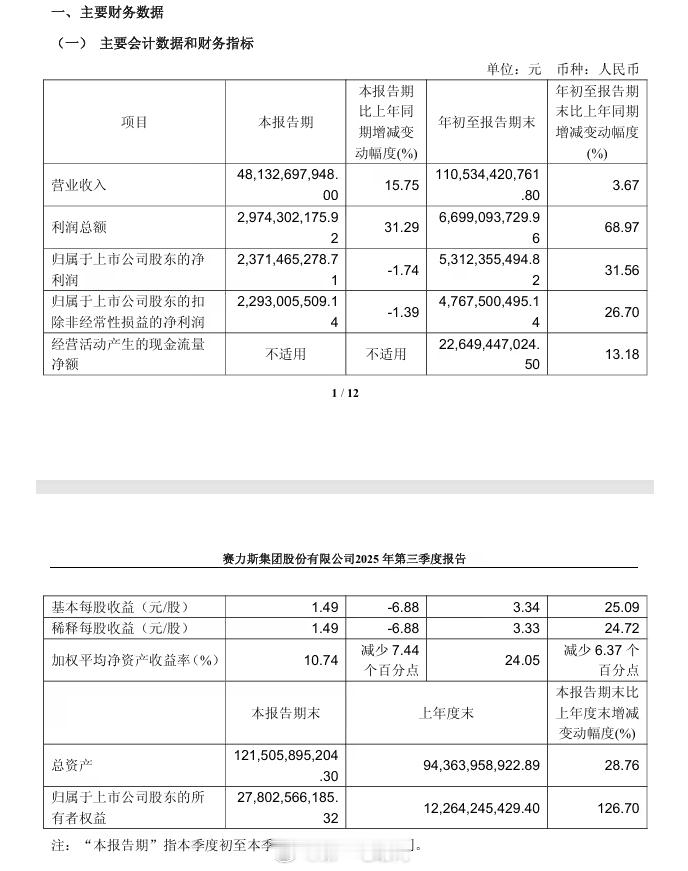 赛力斯2025年第三季度财报:第三季度:营收481.33亿元,同比增长15.75