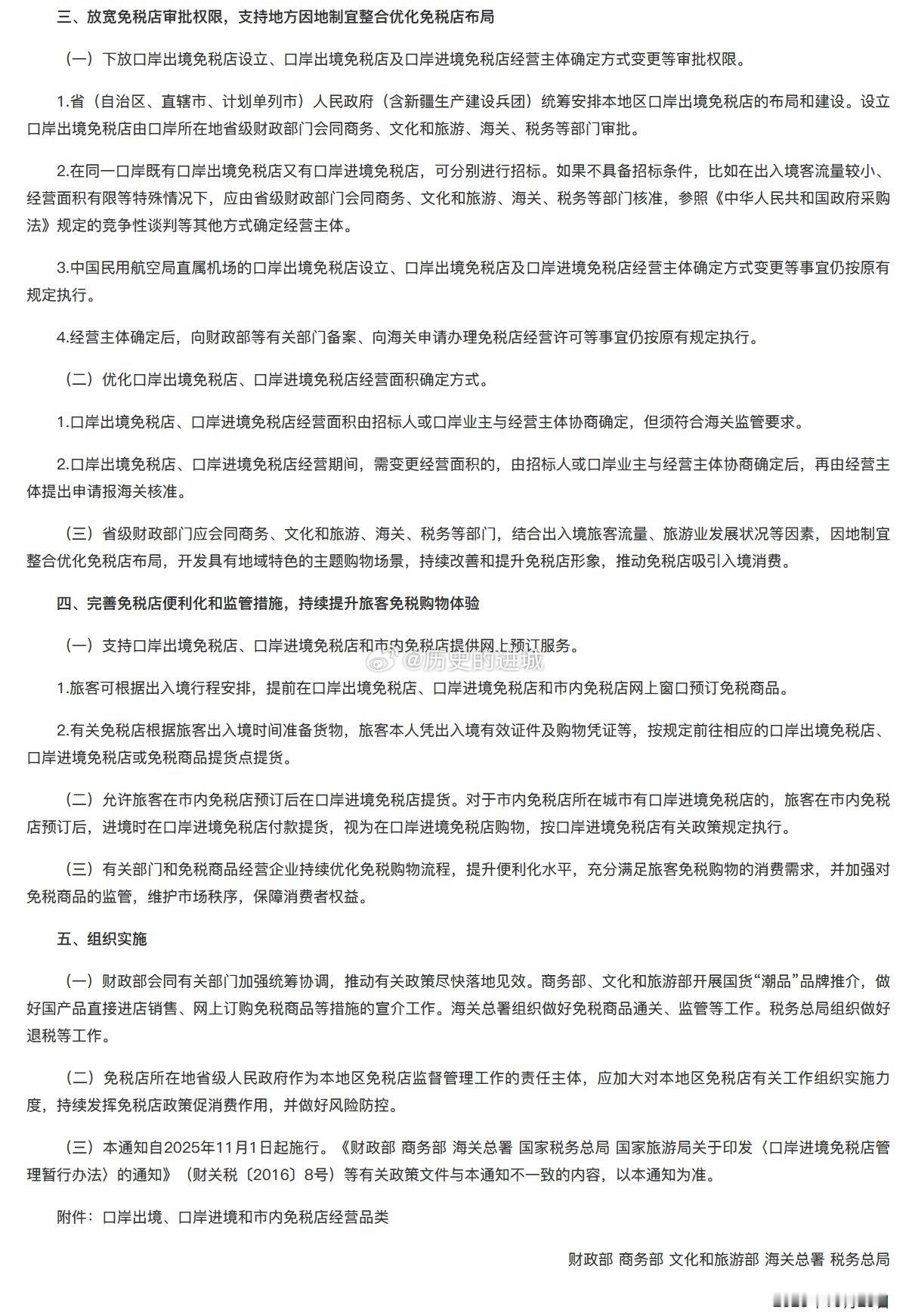 财政部等五部门《关于完善免税店政策支持提振消费的通知》:进一步发挥免税店政策支持提振消费的作用,引导海外消费回流,吸引外籍人员入境消费。积极支持国内商品进入免税店销售。