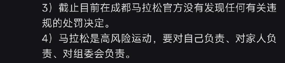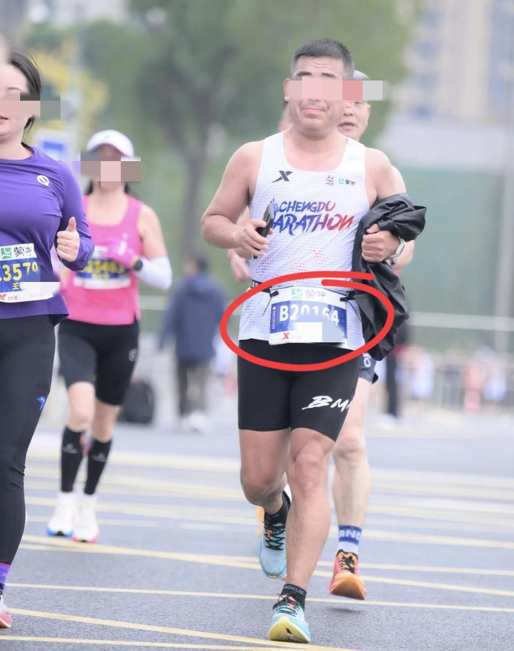 在26号结束的蒙牛成都马拉松,穿紫色衣的C35799女选手与B20164男选手疑似作弊,目击者发现问题后及时报告给了裁判。 目击者称紫衣女在40公里处跨过隔离带进入赛道。 B20164男选手将未拆封的号码簿给紫衣女佩戴后,两人一同奔赴到终点。 紫衣女拿着手机跑余段,男跑者拿着她的黑外套。 号码牌有计时芯片,据称白衣男开始是带着她的号码牌一起跑过计时点,到地方再交给本人。 网友说,看女士的身材并不像能跑全程的。 也有人对她分到C区生疑,一样的套路,以前有无做过呢? 马拉松比赛属于竞技体育,遵守规定,公平公正。不管成绩如何,真实才可贵啊!