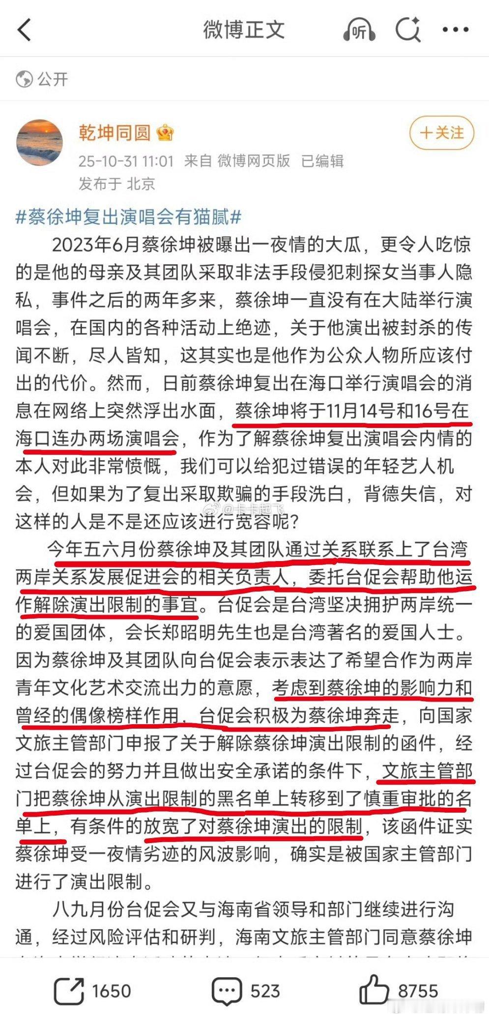 曝蔡徐坤复出演唱会有猫腻我天呐!!!两岸关系都敢打马虎眼,坤坤这是吃了熊心豹子胆么??人家给你机会才让你有舞台,你搞这出???[吃惊][吃惊][吃惊](突然想到内娱某个别艺人,平时大型正规活动都没有他,但是会出现在什么“大湾区晚会”什么正规活动里捎带的犄角旮旯里莫名其妙的大使,是不是也是走的这种门路??!![嘘][嘘][嘘][嘘])