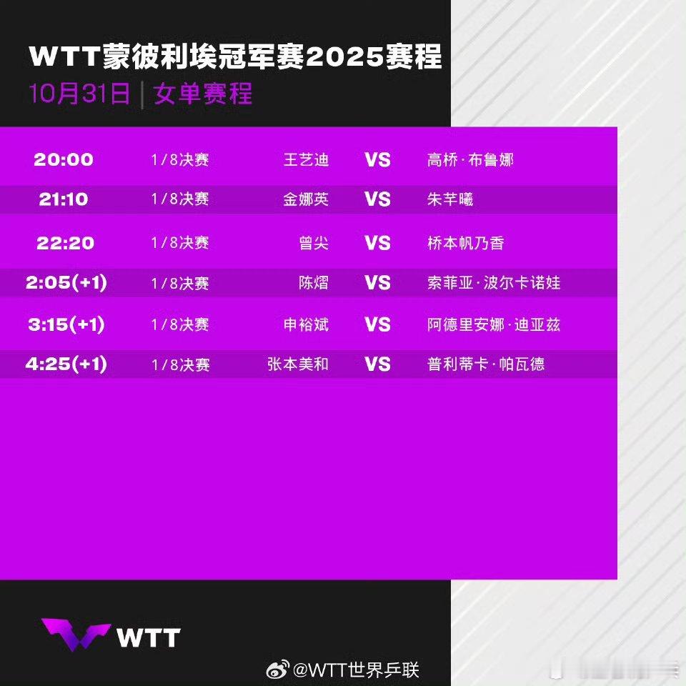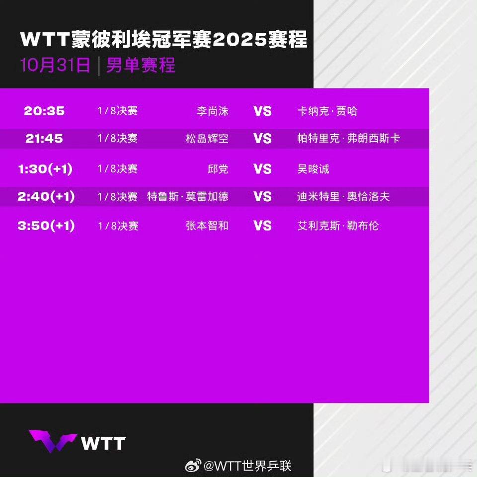 2025年WTT蒙彼利埃冠军赛10月31日中国队赛程